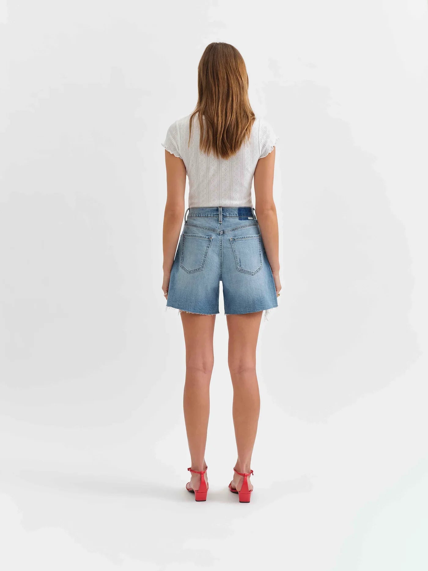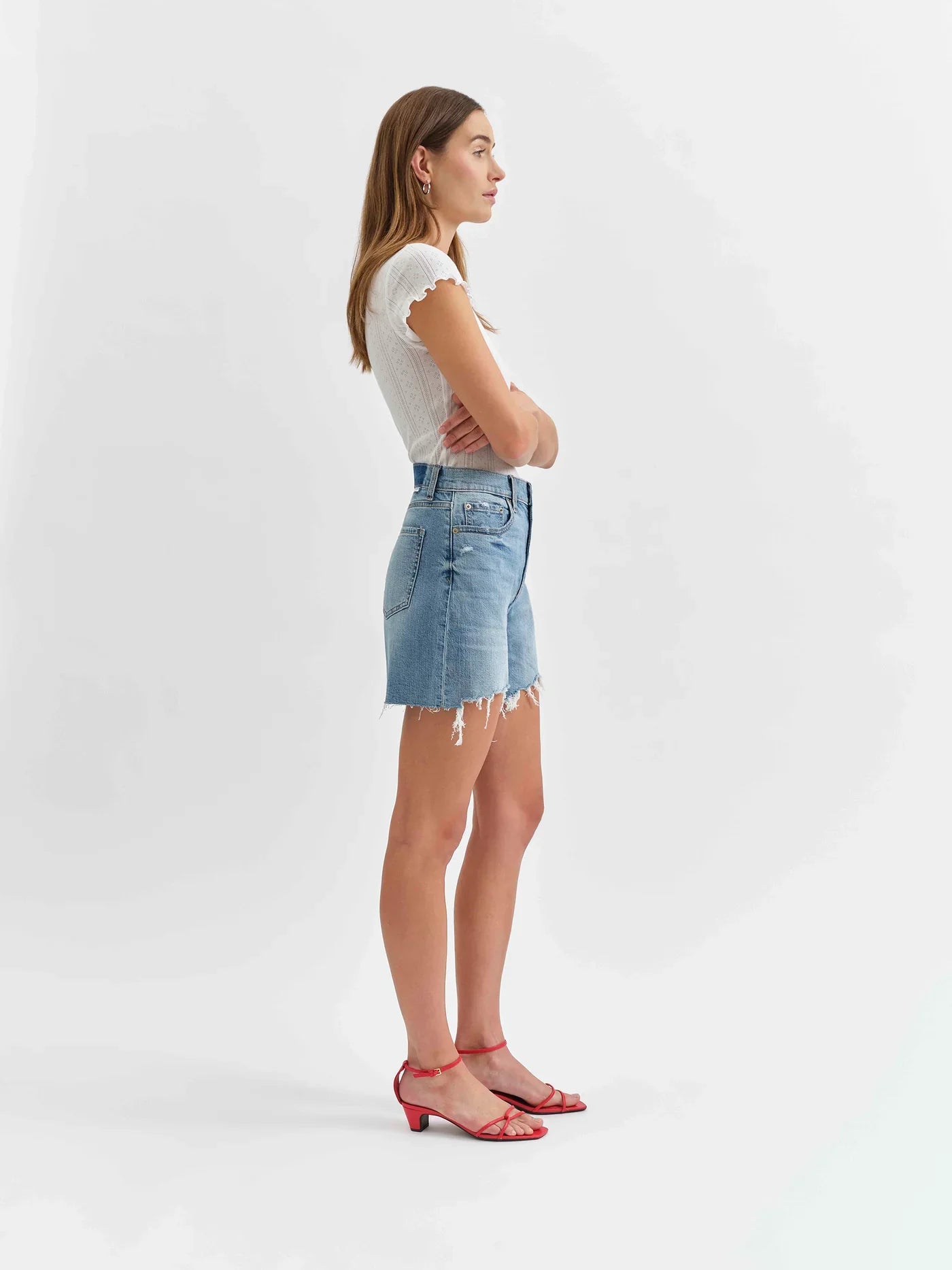 Take it easy like Sunday morning in this mid thigh length short featuring a distressed hem, and mixed metal hardware. Constructed in a medium wash, our "Tough Love" denim it is mostly rigid, but with a touch of stretch.