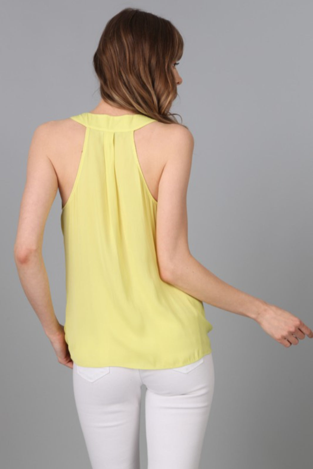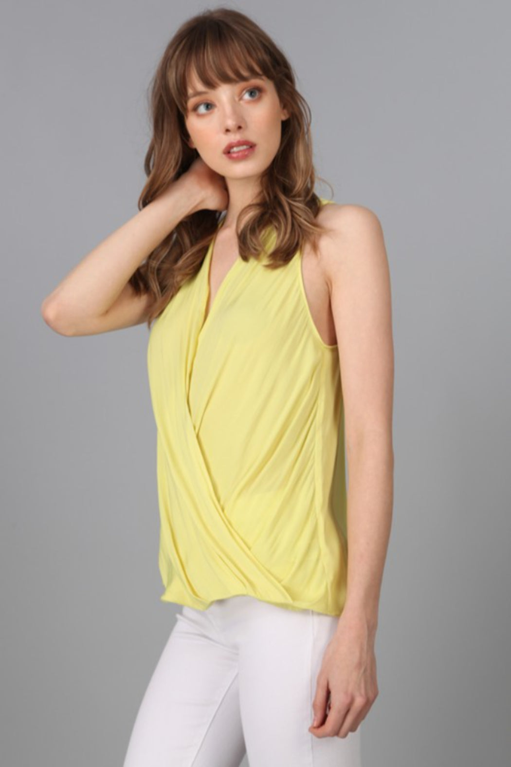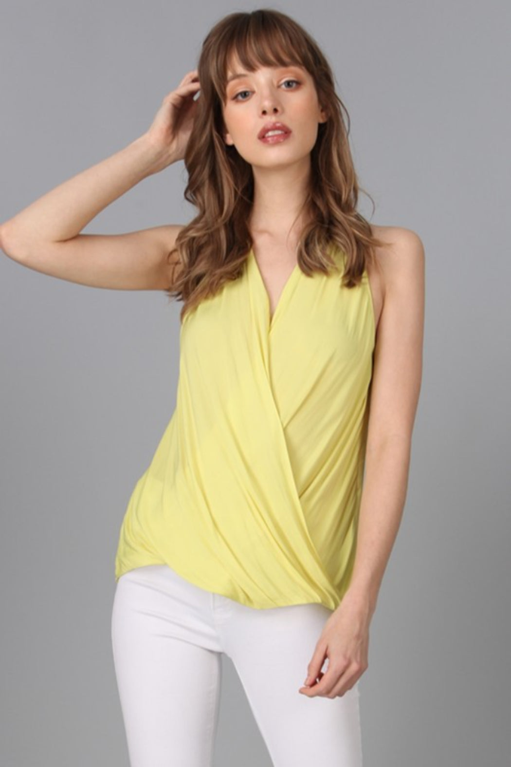 This surplice sleeveless top has a halter back and a v neckline. This shirt is perfect to be worn dress up or casual.