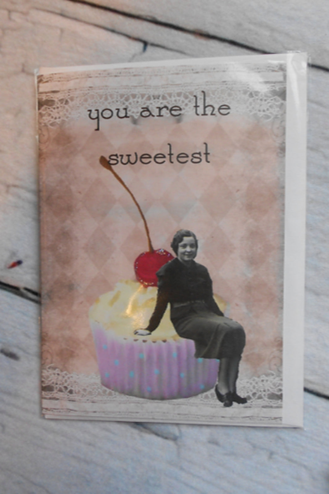 5 x 7 handmade hand glittered greeting card. most of my cards are created with vintage personal family photos or vintage postcards they are all digitally created by me and printed on a matte finish card stock