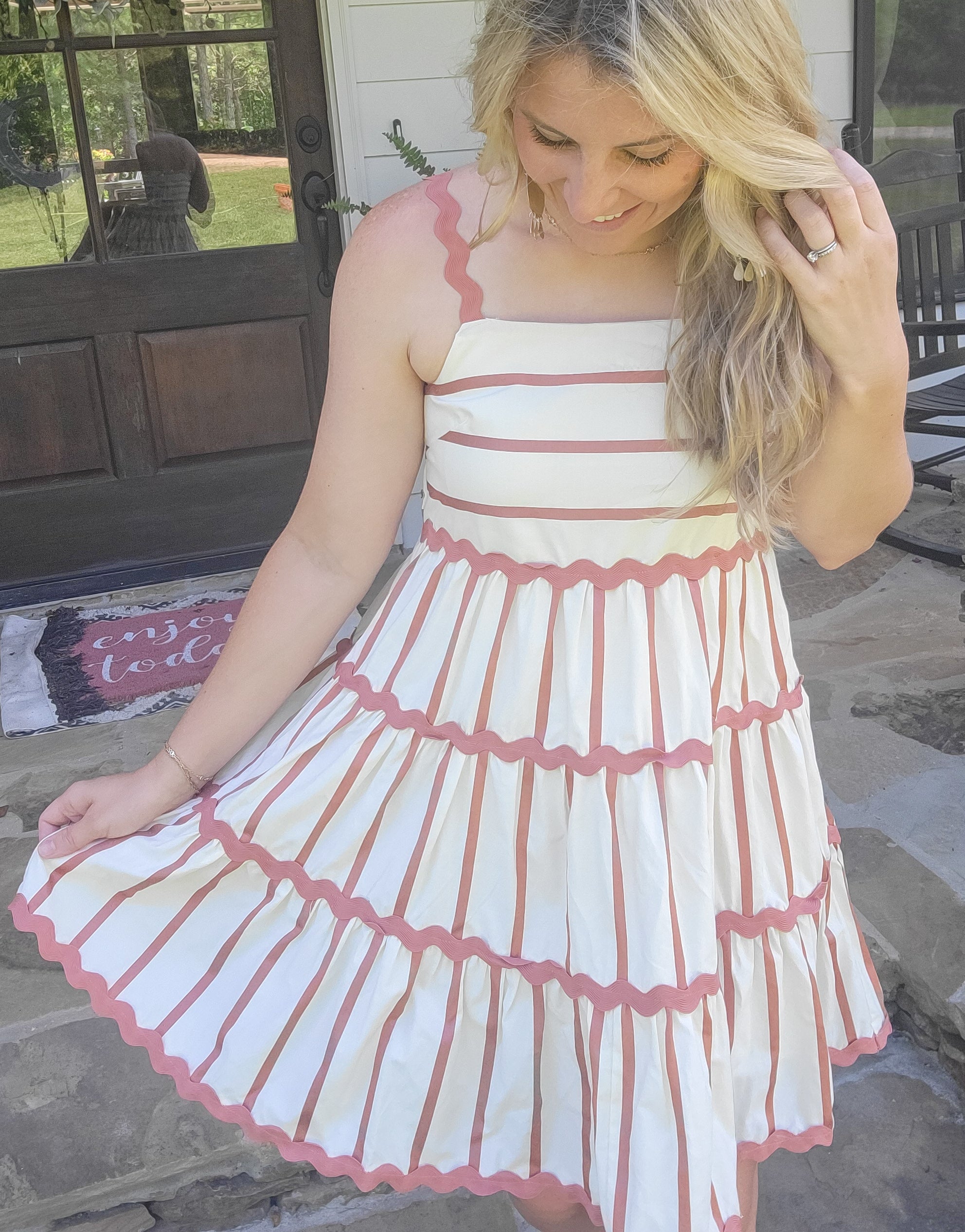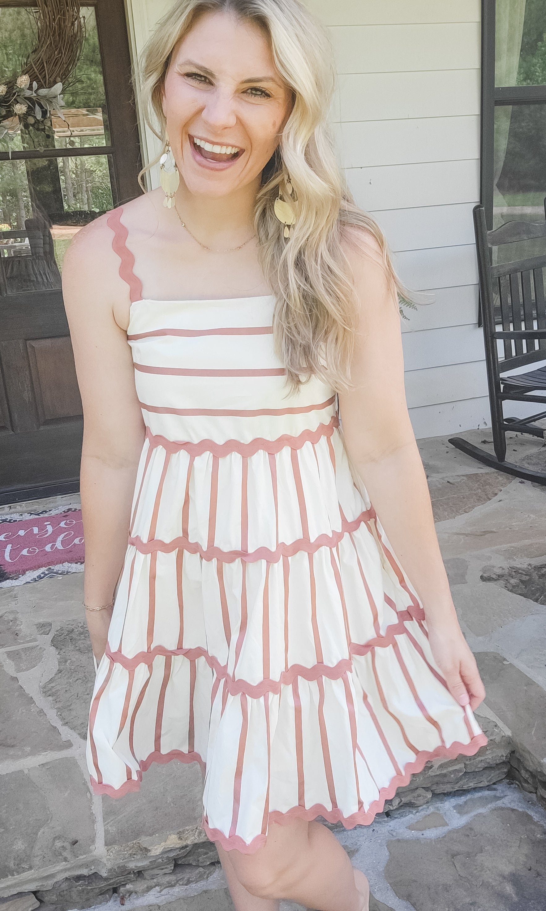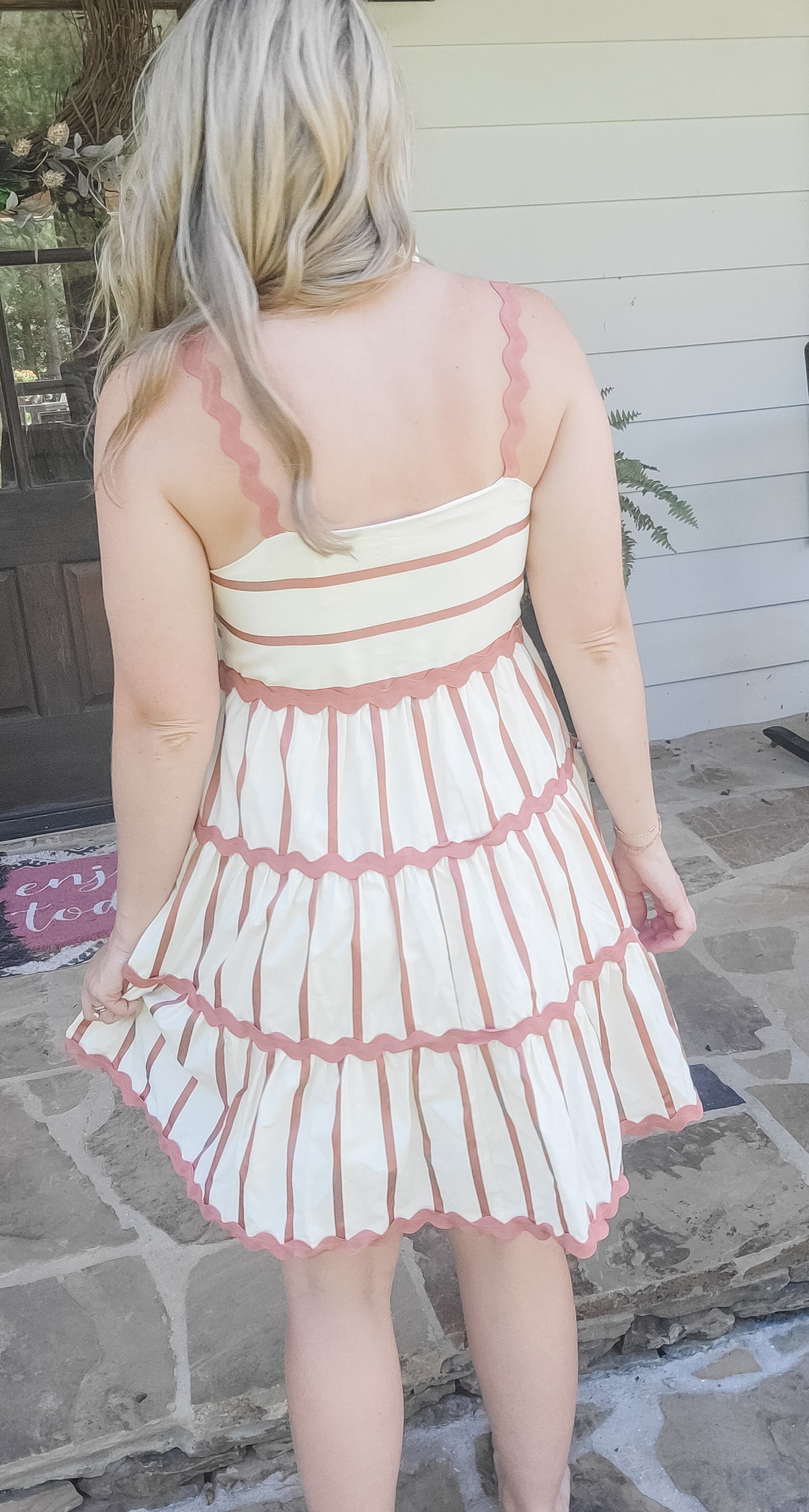 Indulge in sweet dreams with our Sweet Dreams Scalloped Dress! This mini dress features a charming stripe print, square neck, and sleeveless design for a fun and flirty look. The ric rac trim adds a touch of whimsy, while the included pockets and hidden zipper provide convenience. With a lightweight and non-sheer lining, this dress is perfect for any occasion. Available in sizes small to large.