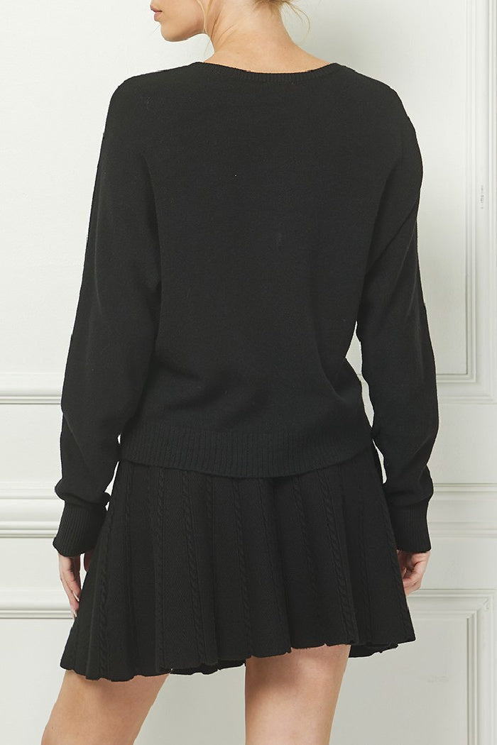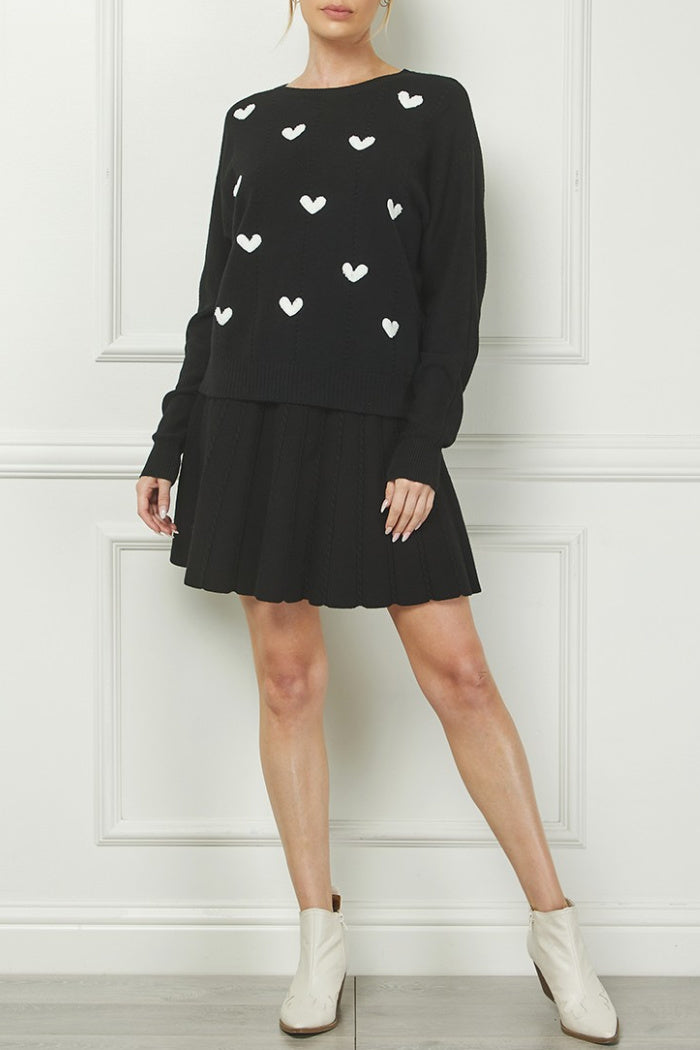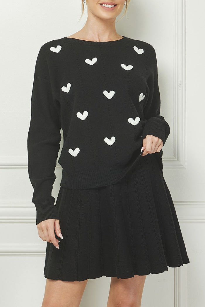 Classic knit, crew neck sweater with ribbed cuff, collar and hemline. Heart Motif. Model is wearing a size small. Refer to measurements for your perfect fit.