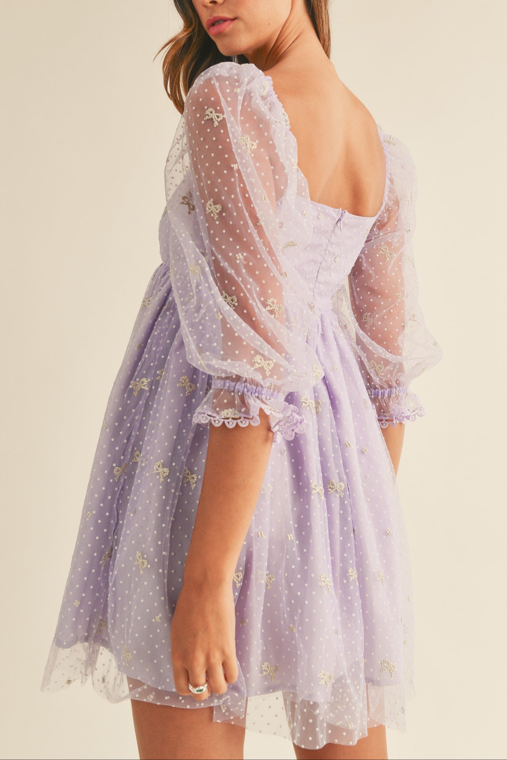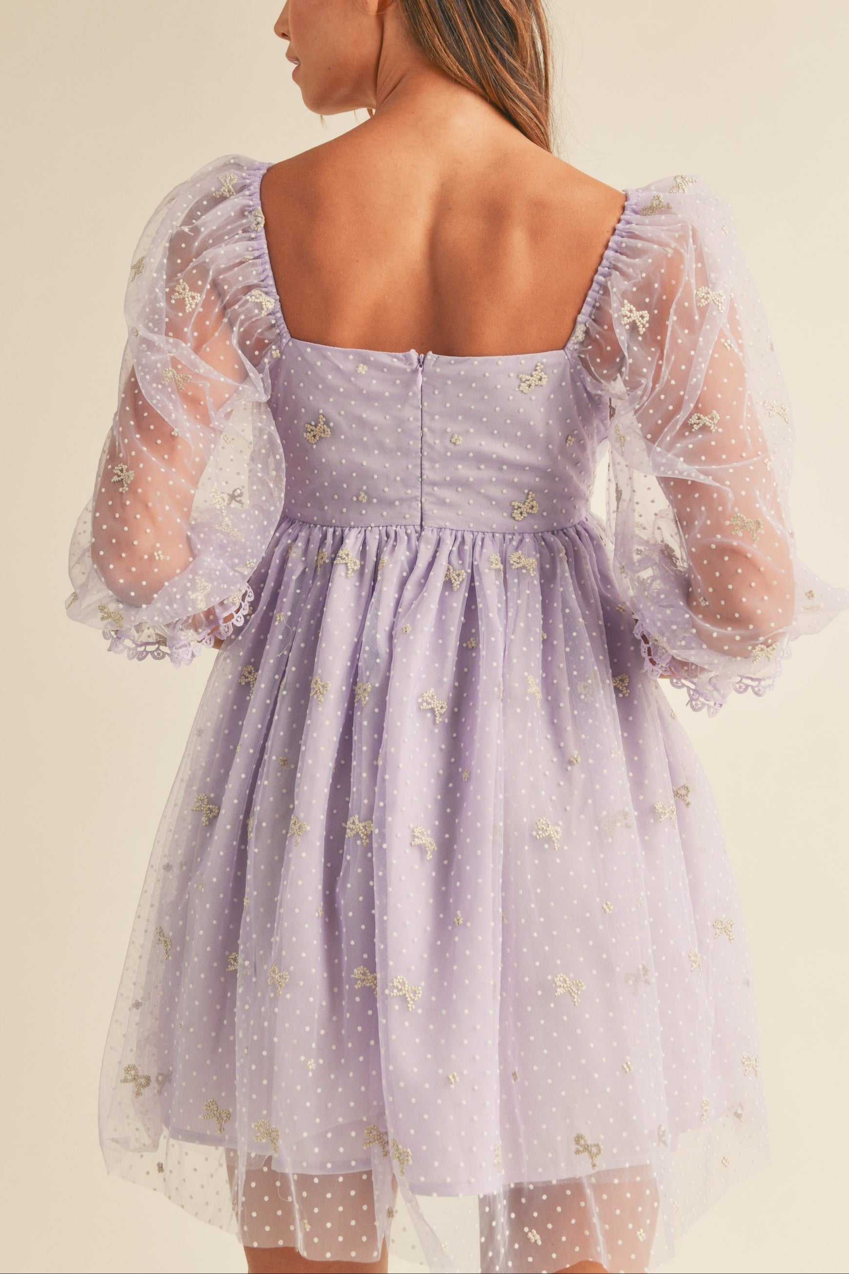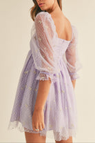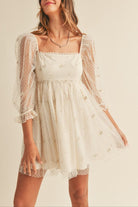 Expertly crafted with delicate embroidery and a charming ribbon print on swiss dot mesh, this 3/4 sleeve babydoll mini dress exudes elegance. The back invisible zipper ensures a seamless fit, while the comfortable lining adds to its premium quality. Elevate your style with this perfect blend of fashion and functionality.