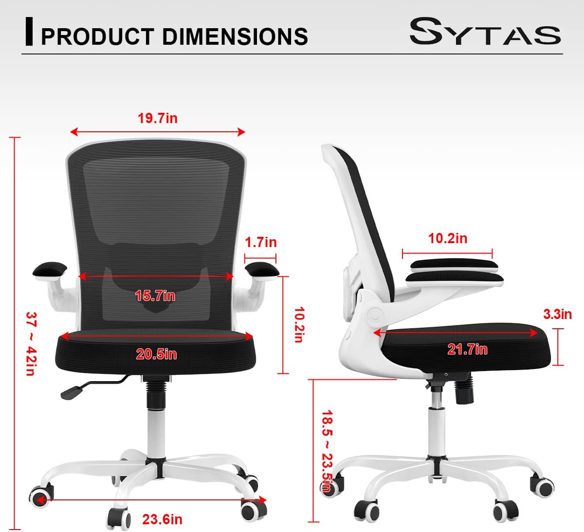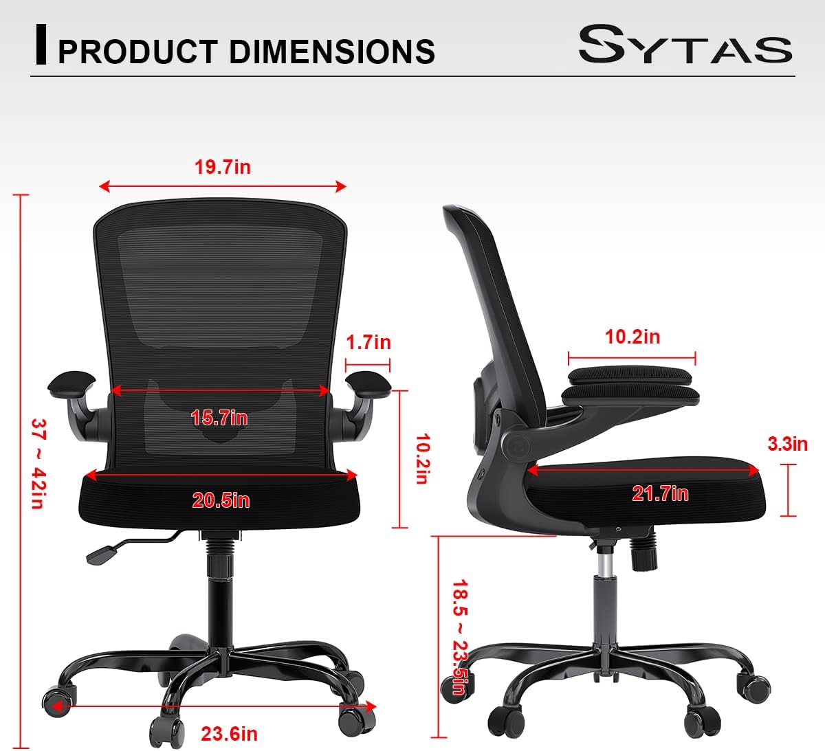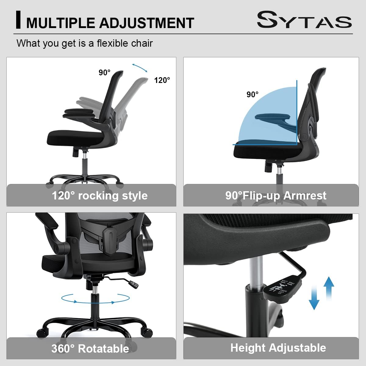 - 【Multi-adjustable Office Chair】Sytas adjustable desk office chair for home office chair has a 90°-120° rocking style, you can control it by adjusting the tension knob and adjustable rod at the bottom of the cushion. Pneumatic height adjustable from 18.11 inch to 21.06 inch, match different stature. Weight capacity: 250lb.