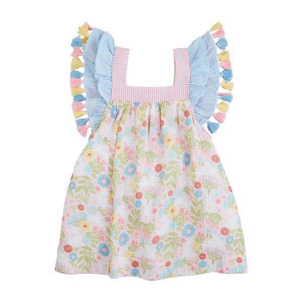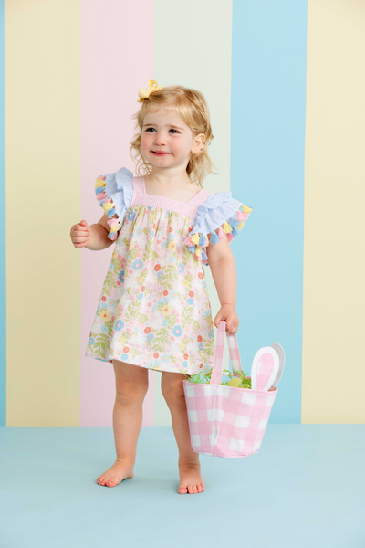 Adorn your little one in our enchanting Girl's Tassel Bunny Dress. This delightful dress is made from soft cotton gauze and features adorable seersucker flutter sleeves with charming tassel trim. It's perfect for toddlers and baby girls, making it an ideal outfit for Easter gatherings or any special occasion. Taking care of this dress is easy - simply turn it inside out, machine wash cold with like colors, avoid bleaching, tumble dry low, and use a cool iron if needed. The body of the dress is made of 100% Cotton, while the sleeves are a blend of 85% Polyester and 15% Cotton, ensuring both comfort and style for your precious girl.