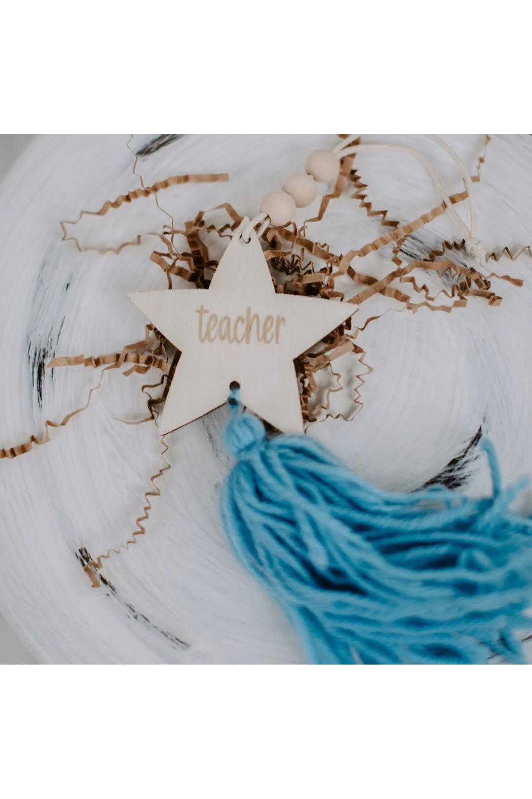 -Wooden teacher ornament with beads and tassel
