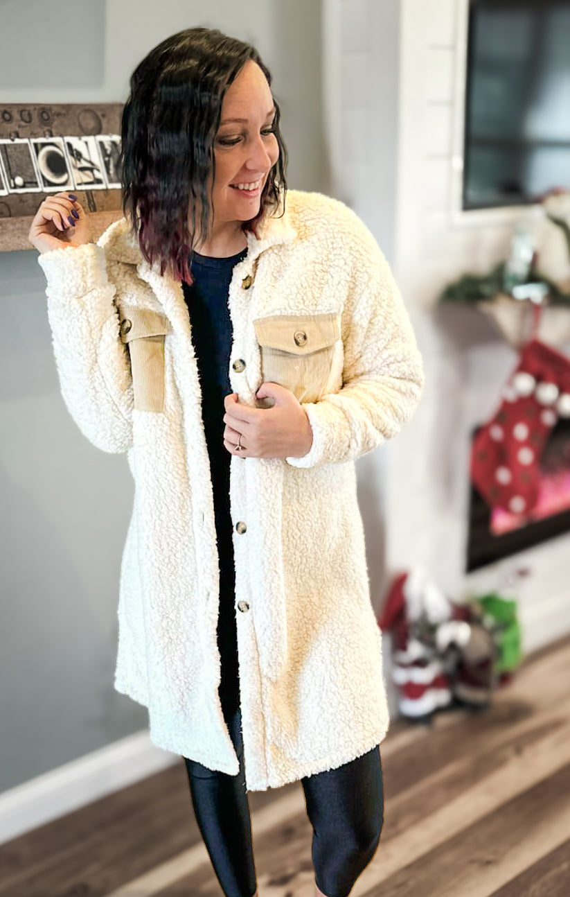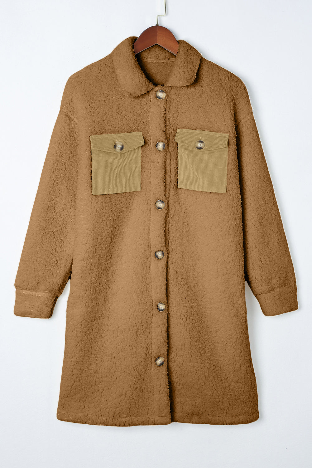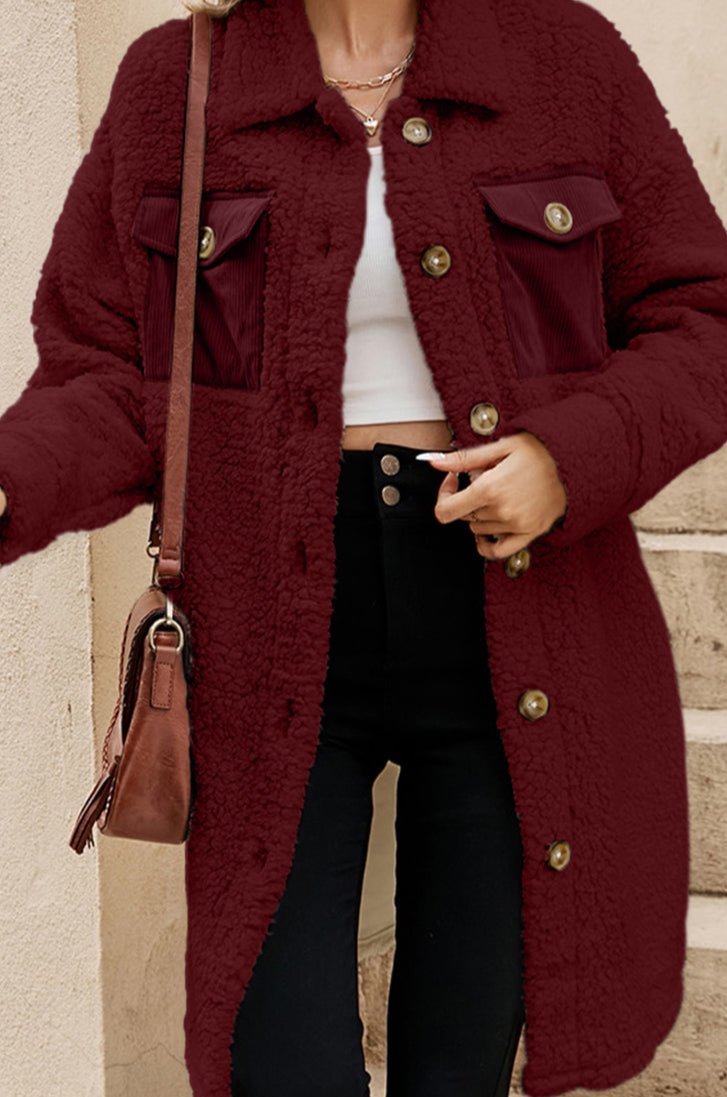 Get ready for winter with this trendy and warm teddy coat. Chic contrast flap pockets add a touch of flair to this gentle coat. The single-breasted design gives off a sophisticated vibe. Wear it with jeans or leggings and brave the cold in style.