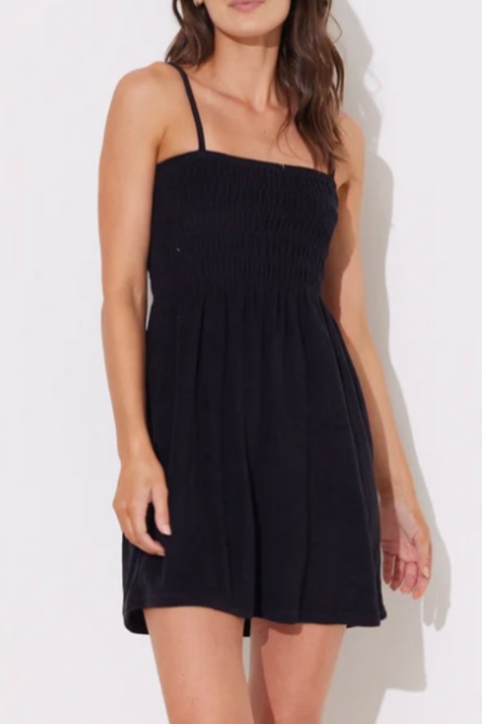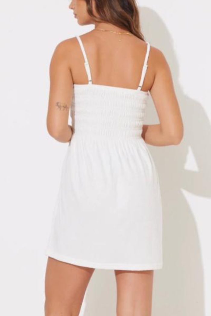 This soft Terry cloth halter dress features a smocked top and spaghetti straps that are adjustable.