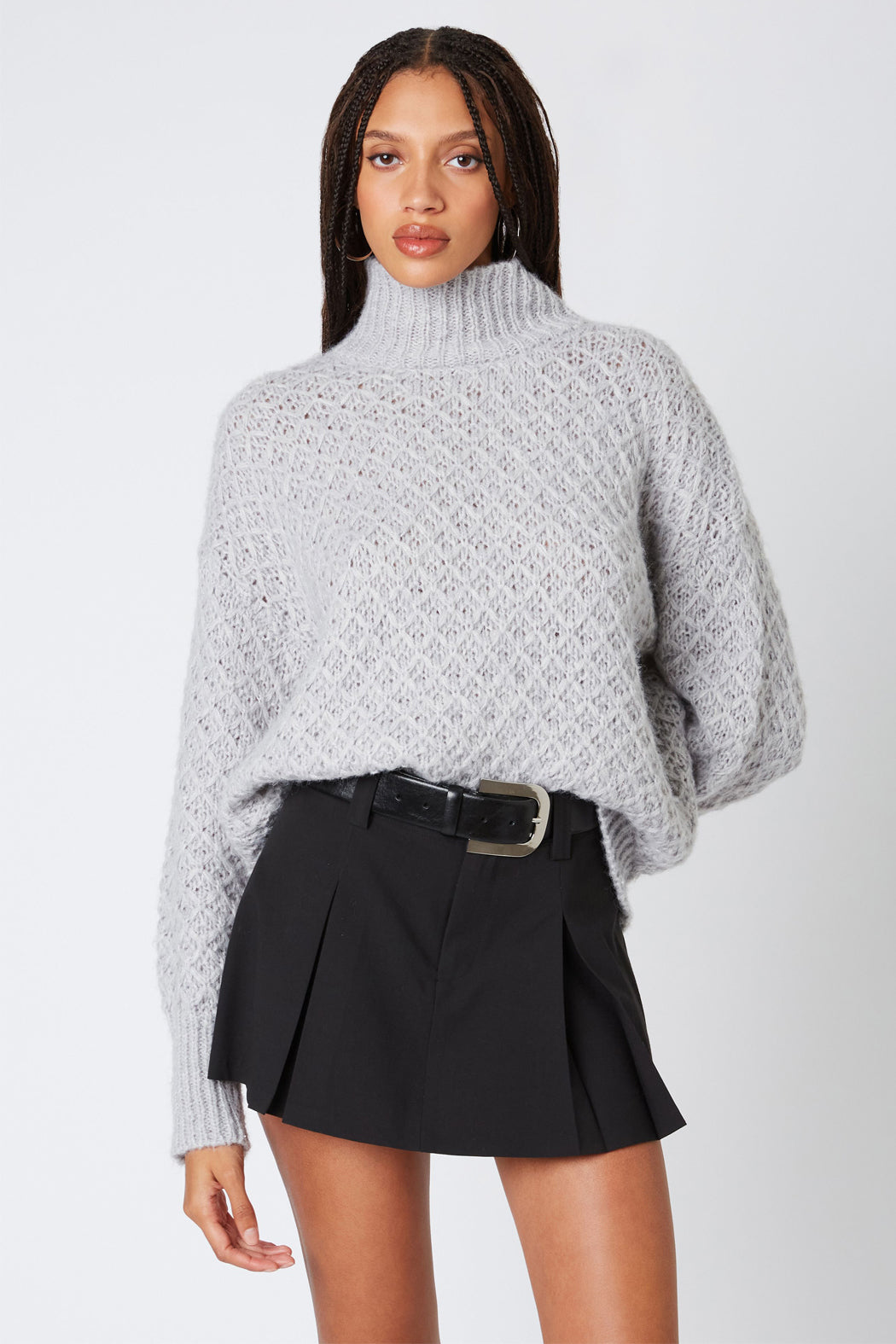 This light grey turtleneck sweater features a diamond knit texture with a ribbed turtleneck and cuffs. Pair with the Sundaze leather pants for a cozy elevated winter look. Follow @lunaboutiquecanton on instagram and DM us with any questions :)