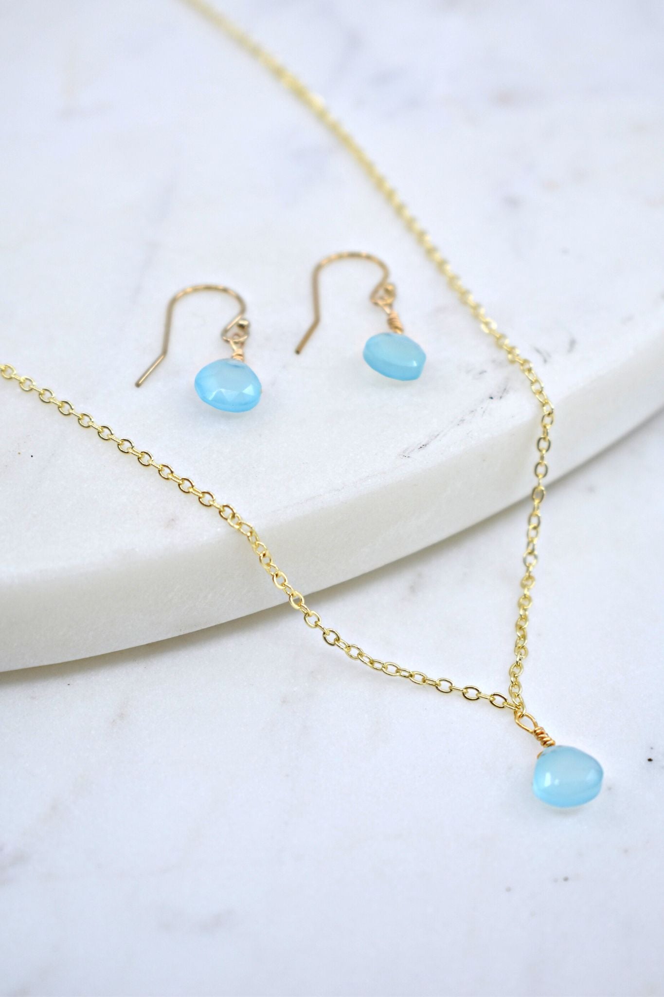 A dainty chalcedony stone hand wrapped to create a simple but sweet necklace and earring set. Stones are wrapped in a 14k gold wire. The necklace is a vermeil chain with a lobster clasp.