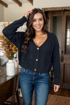 Stay cozy and stylish with The Essential Cable Knit Cardigan. Its cable knit design adds a touch of texture, while the cropped length and button closure give a trendy twist. Keep warm in cool weather with its long sleeves and snuggly, solid black fabric. Perfect for any outfit!