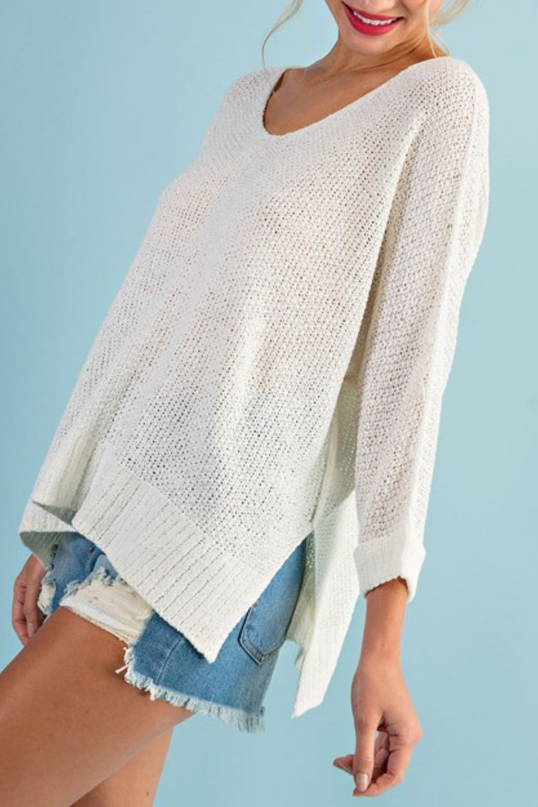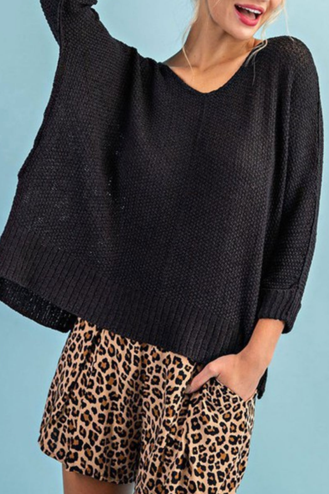 This sweater features a high-low hem with side slits and folded cuffs on 3/4 length sleeves. Loose fitting and sooo comfy!
