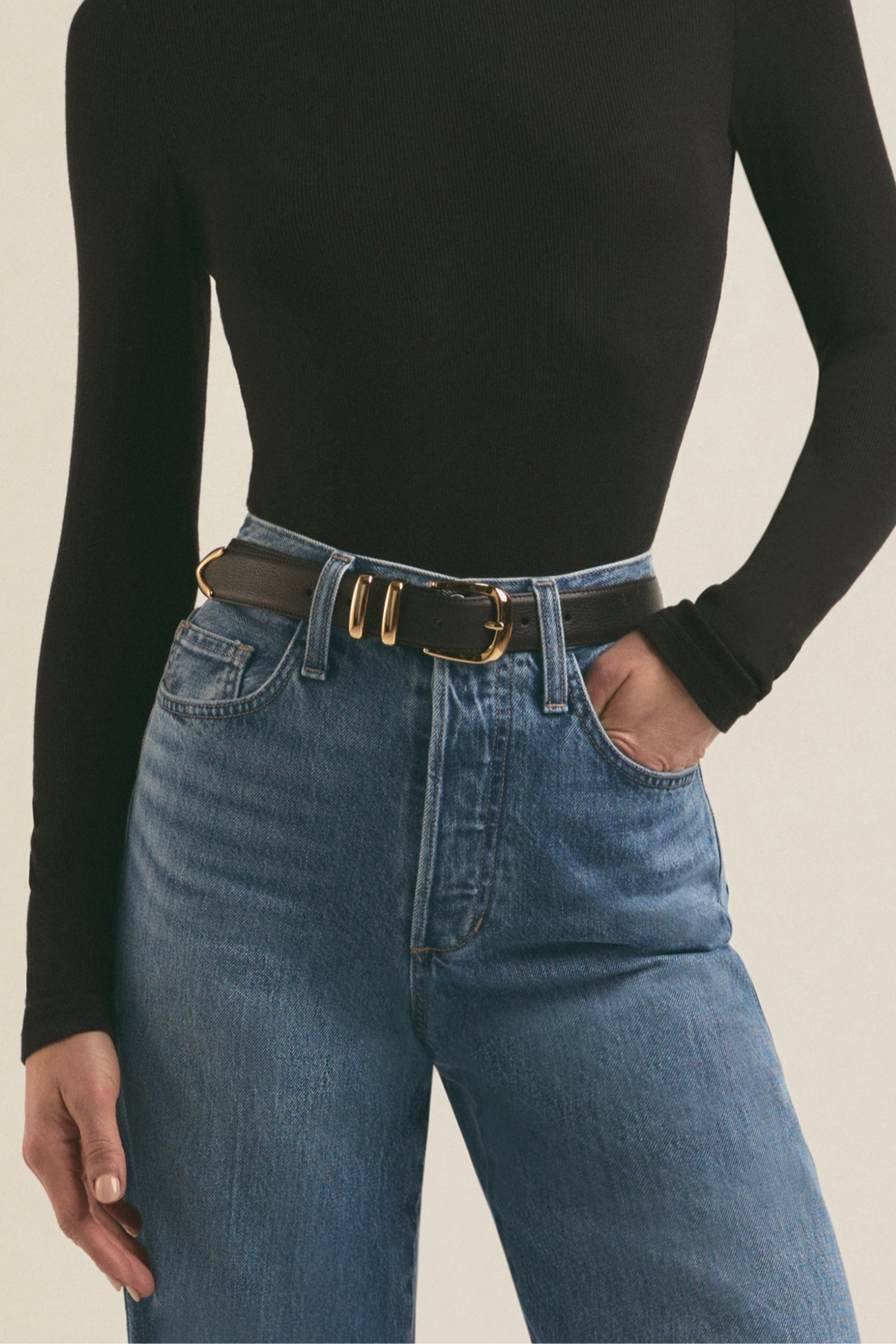 Buckle up--The Jordan Belt will be your new favorite accessory. This 30mm black belt is crafted from soft and supple leather with feather edge detailing and polished hardware. We especially love the seven prong holes that make it easy to adjust sizing so you can wear it slung at the hips or buckled at your waist.