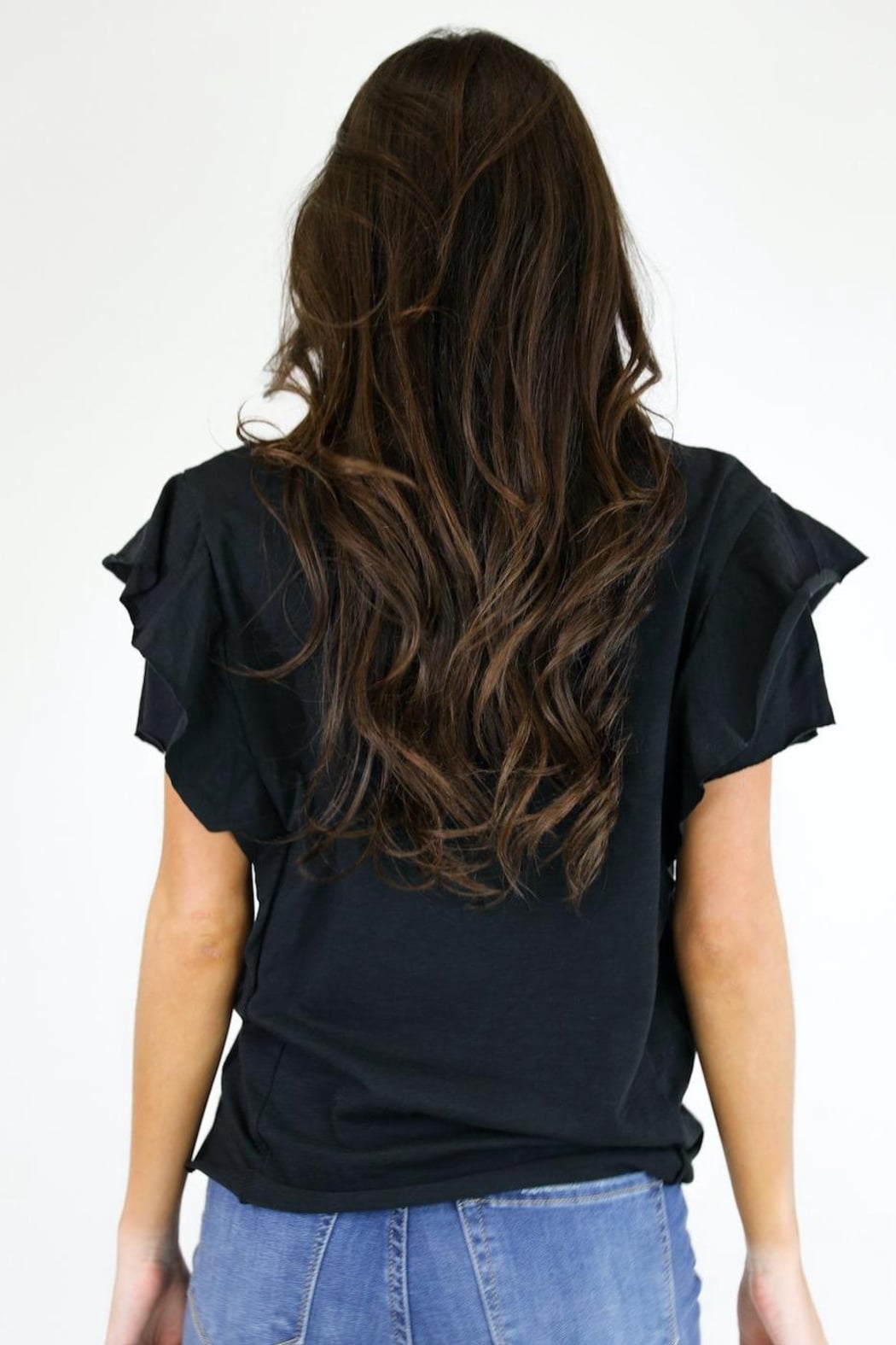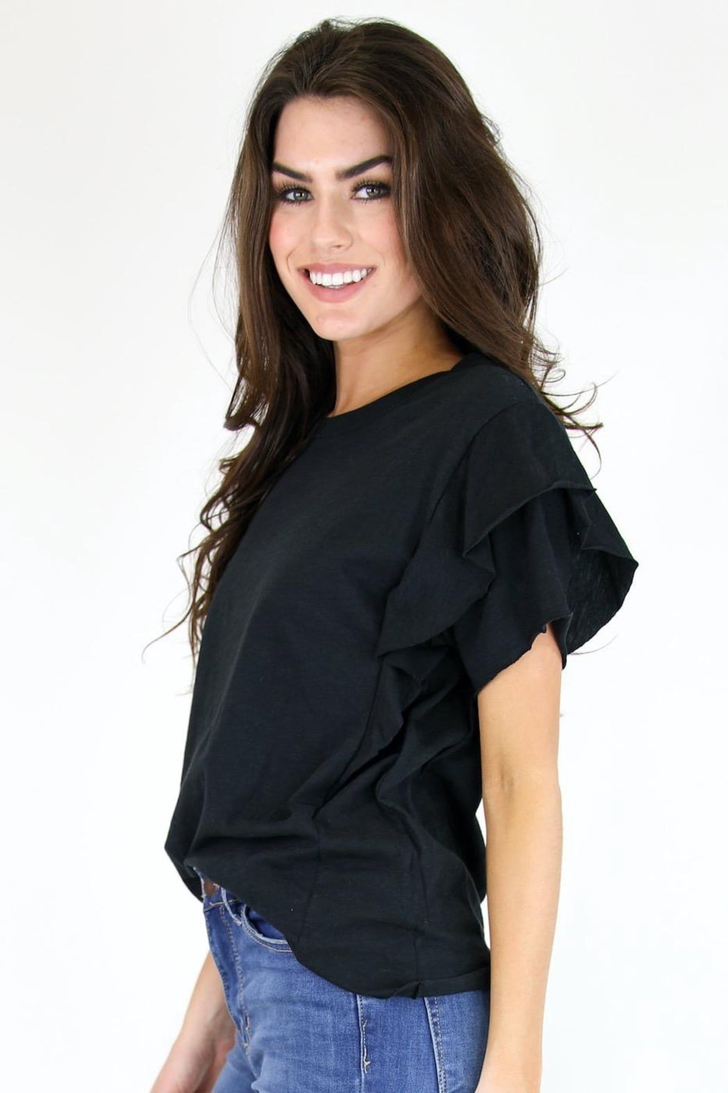 This is the perfect tee! It is solid black and features cute ruffle sleeves :).