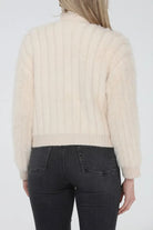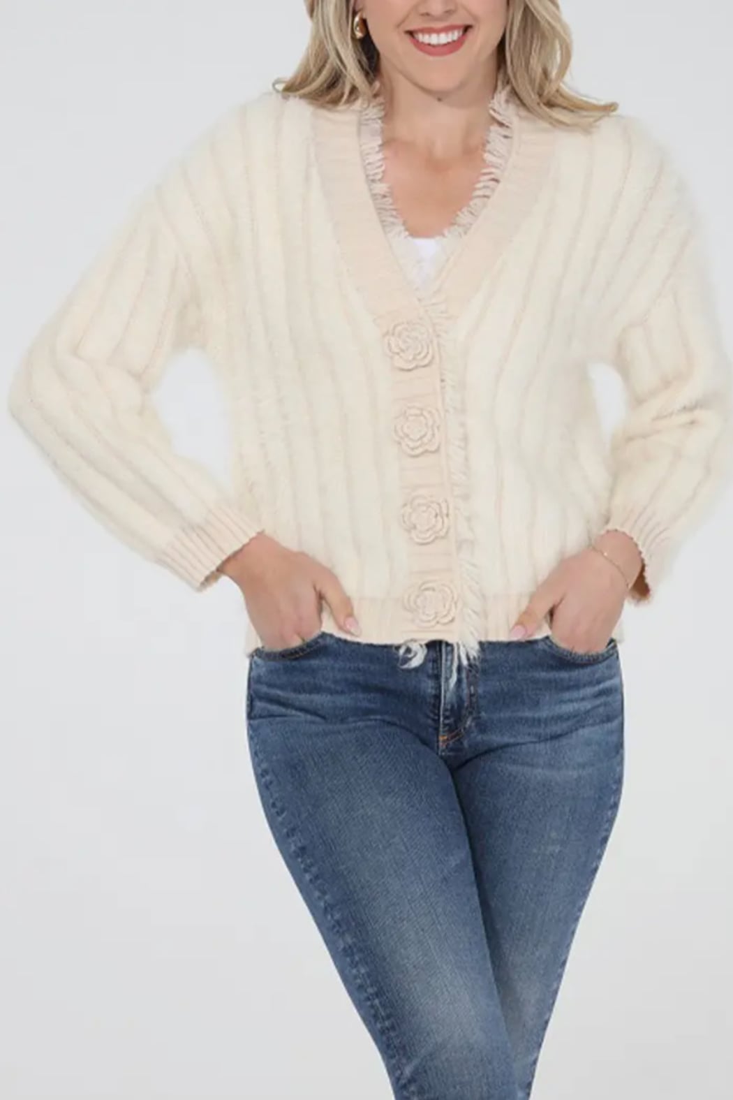 THE PETAL CARDIGAN: MADE WITH SOFT, FUZZY MATERIAL, THIS CARDIGAN FEATURES A FUN FLORAL PATTERN ALONG THE TRIM FOR A PLAYFUL TOUCH.