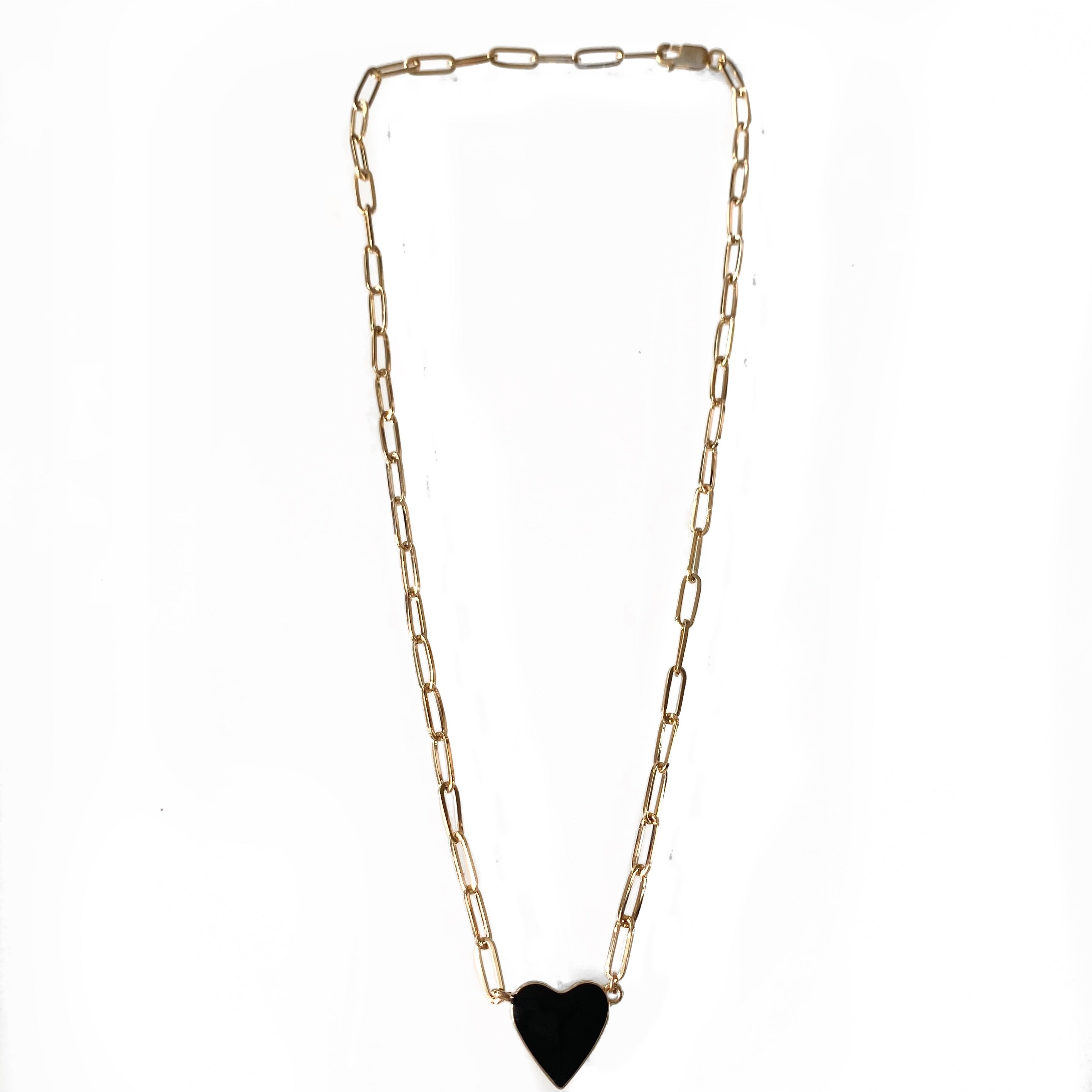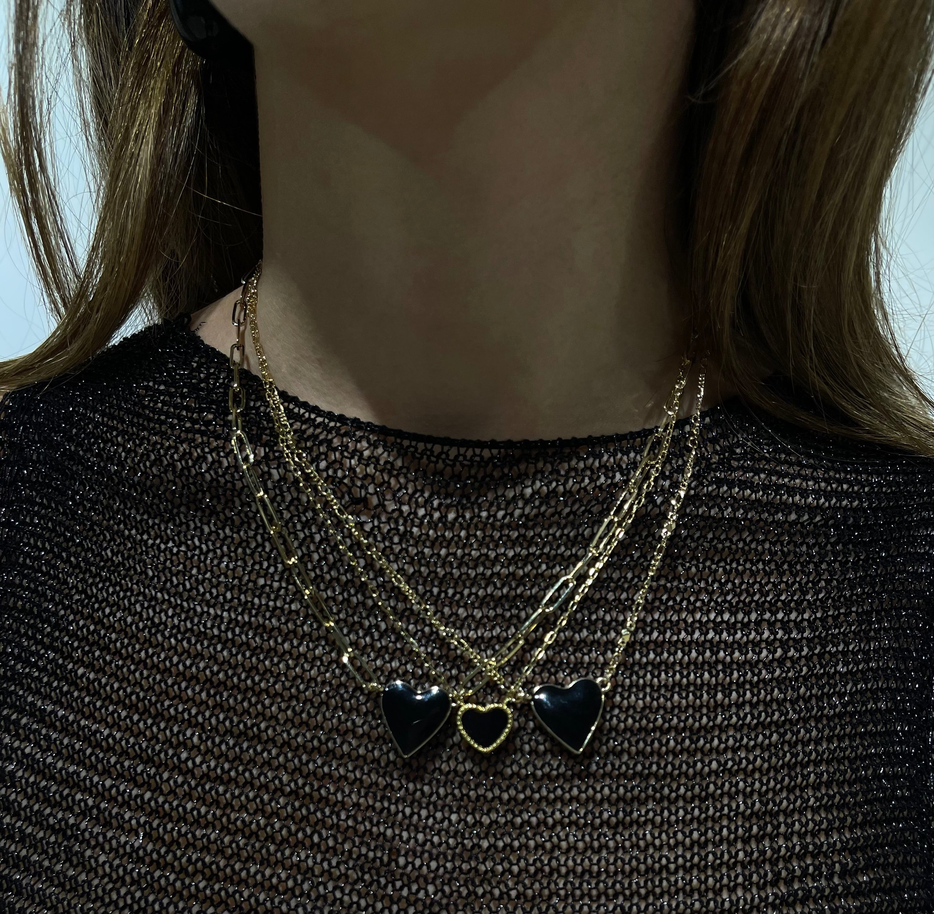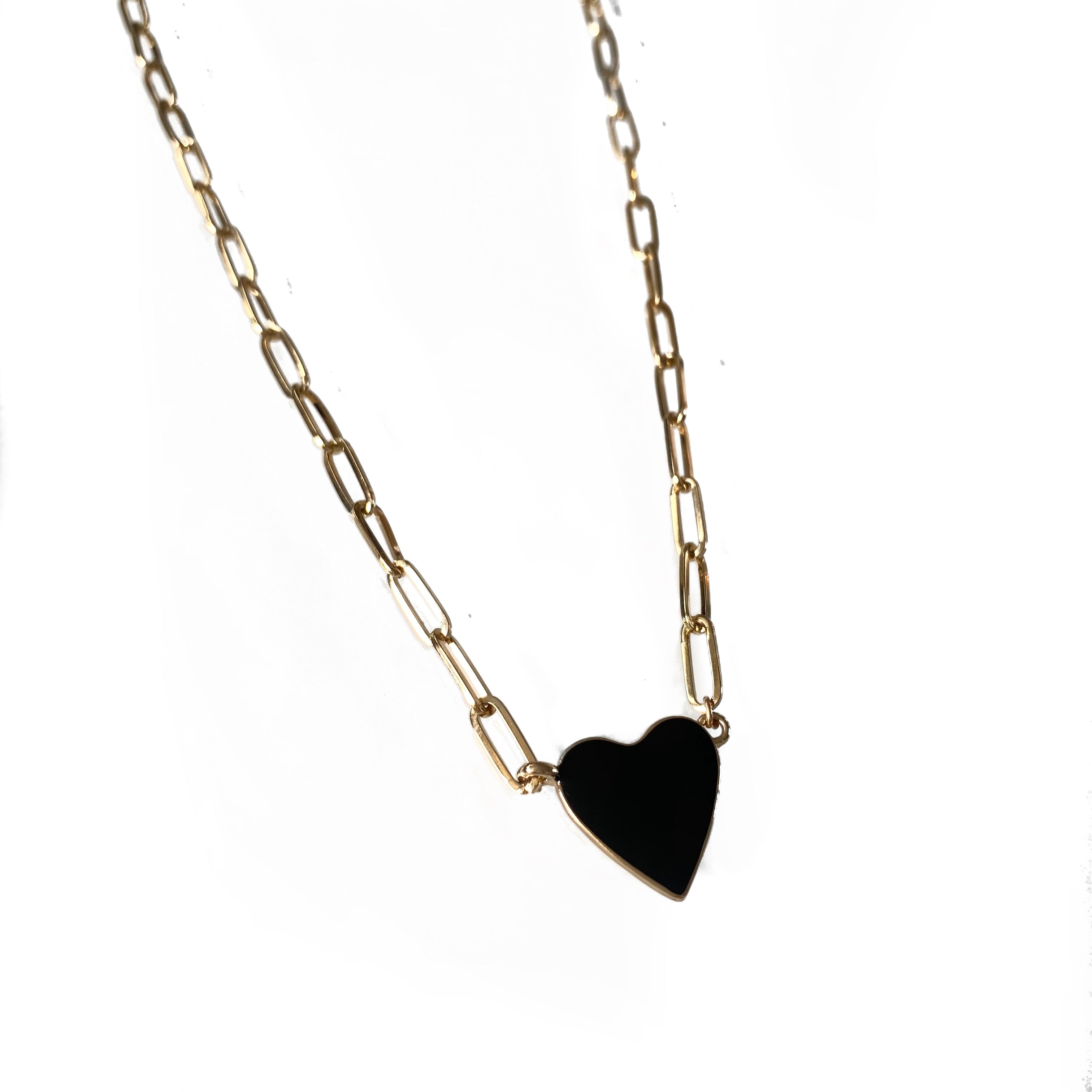 Unleash your inner romantic with The Twilight Whisper! This exquisite necklace features a stunning black enamel heart delicately suspended from a gold link chain. Perfect for adding a touch of elegance and charm to any look. Fall in love with its timeless beauty.