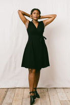 Wraps across the front bodice, with 2 different button options on the inside and a tie sash on the outside. Big deep side-seam pockets that you can fit a small puppy in. Clean finished bias binded arm holes & a neck line that goes all the way to the bottom hem. Princess seamed in the front and back for the best fit and to flatter the curves. A line and hits just below the knee.