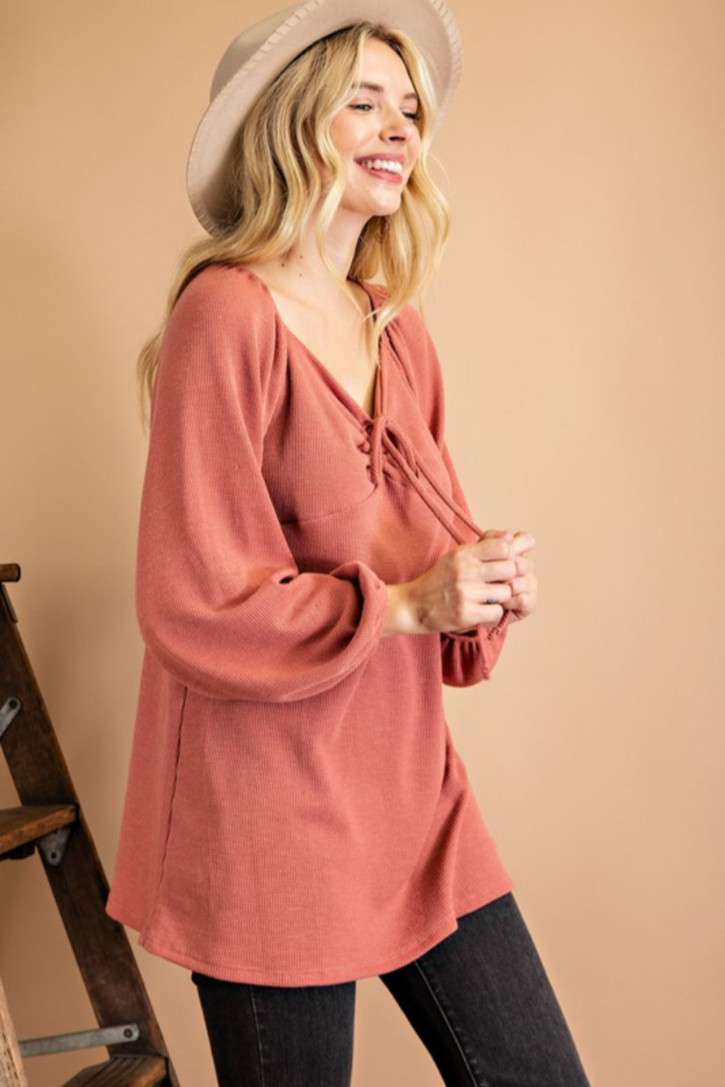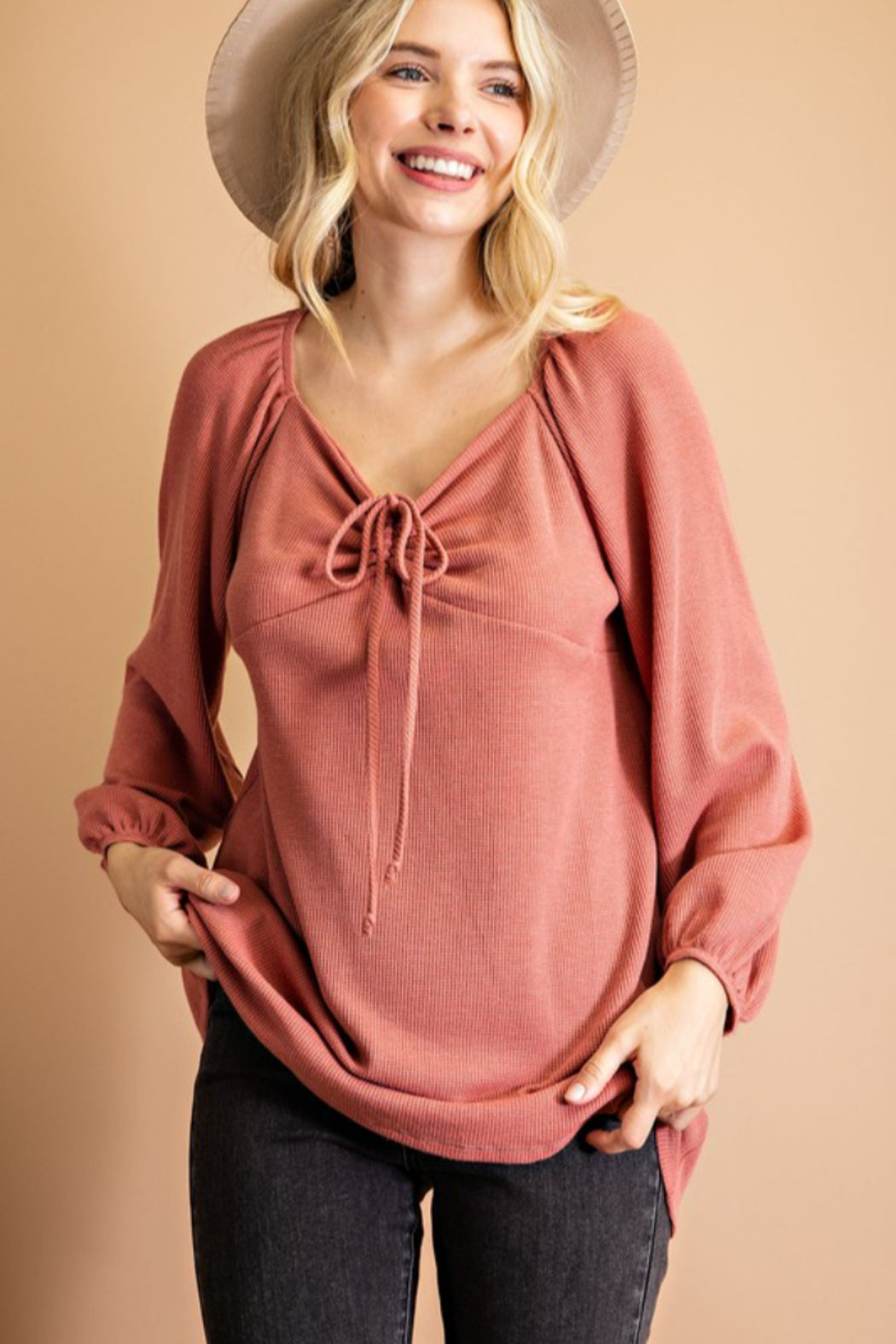 This thermal knit top features long sleeves and a ruched chest detail. Looks great with your favorite pair of denim.
