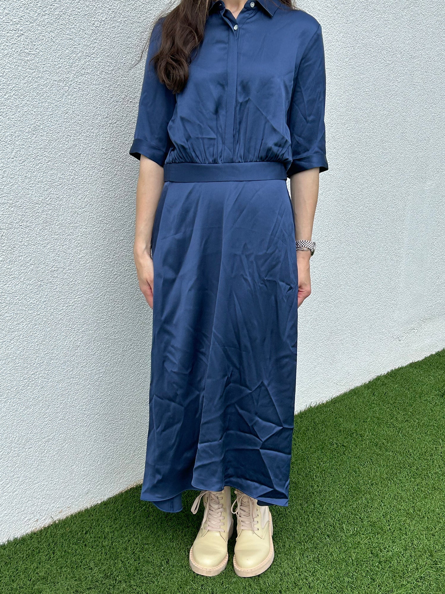 •LOOK: New from Third is a beautifully shaped and uncomplicated style elastic waist shirt dress. The bodice has a classic look with a hidden placket and pointed collar. The waist is defined by easy shaping and a feminine satin cummerbundt in the front. The back is a funky elastic waistband that adds cool visual interest. The A-line midi shirt dress in vibrant satiny fabric gracefully falls to a hi-low hem. Ideal dress for a daytime or evening occasion. This elastic waist midi dress catches the light as you capture attention for your exquisite fashion sense.