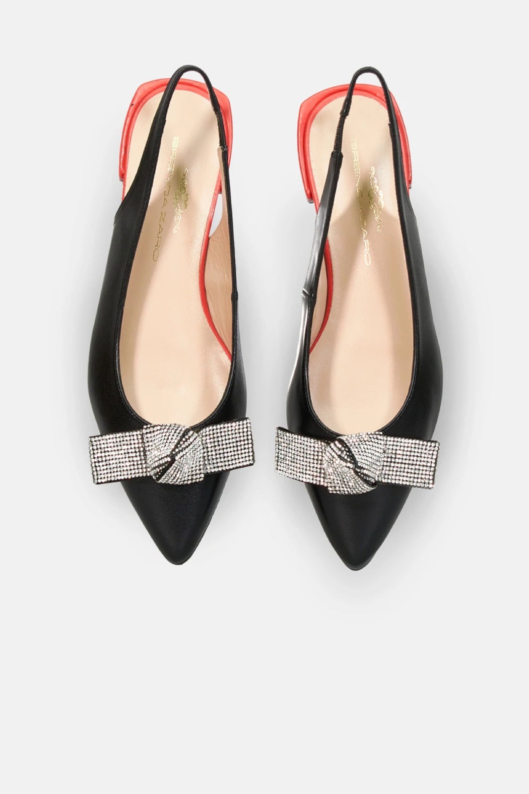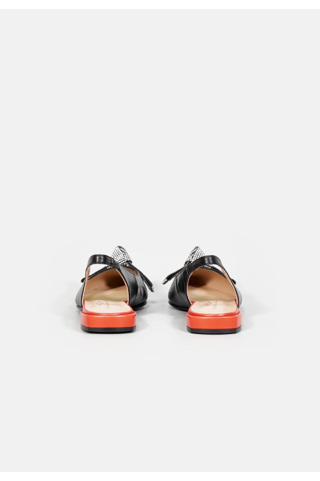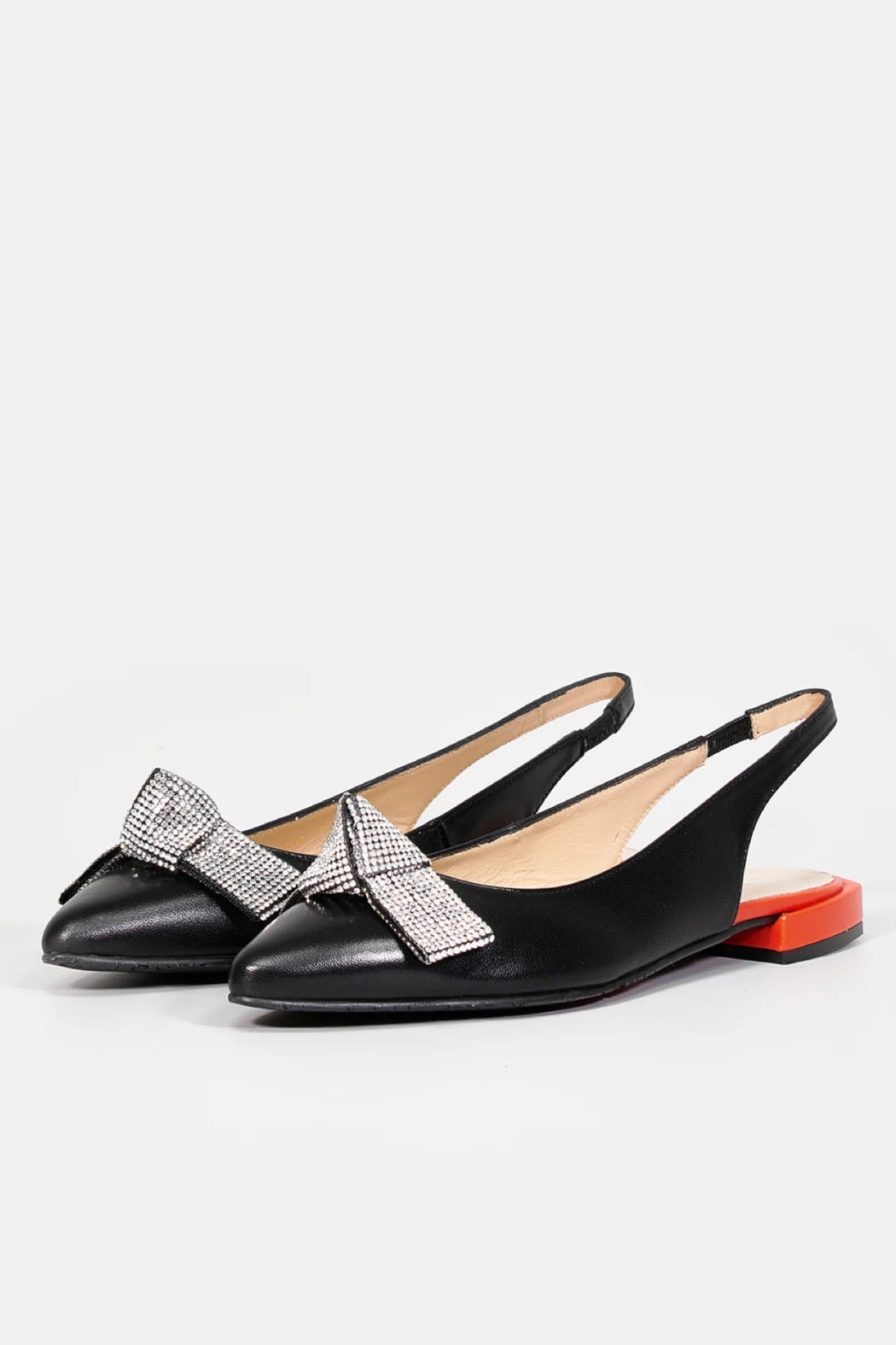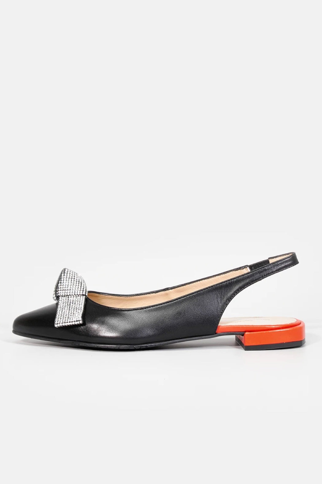 is a wonderful flat with a beautiful design where simplicity is mixed with extravagance. The beautiful intense black leather blends with the coral red of the leather of its 1 cm heel. Its fresh design is reinforced with the undercut part that we see adjusting with an elastic to the tone and ends at its tip with a bow of STRASS.