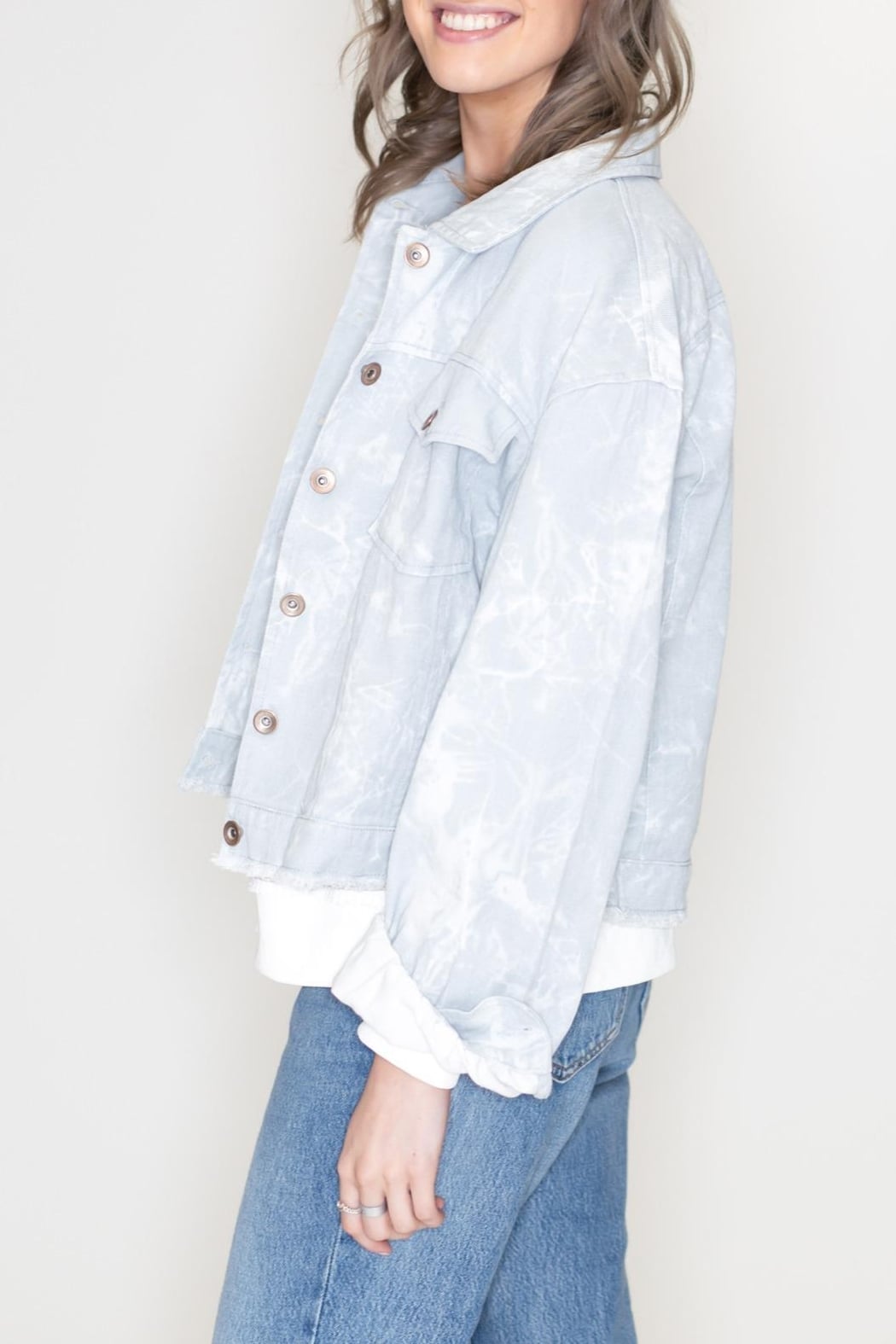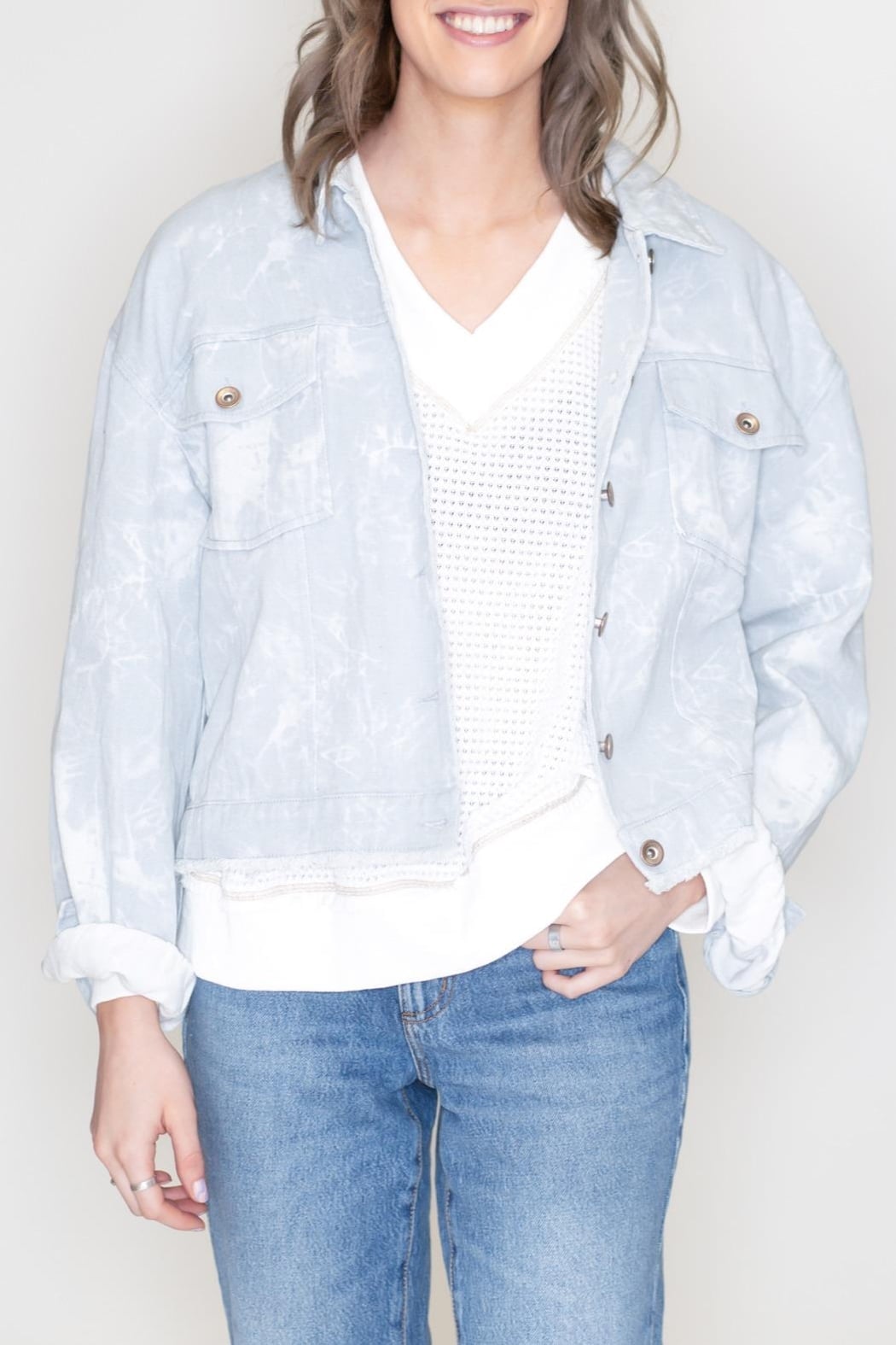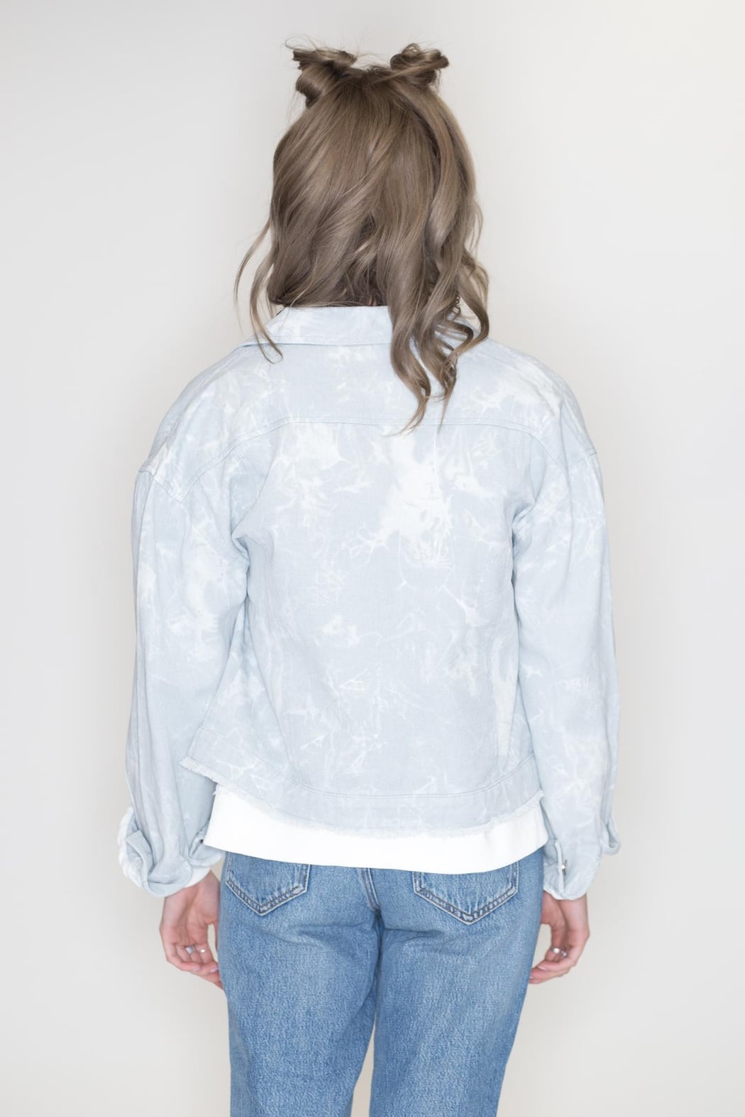 Light blue tie-dye denim jacket. This gorgeous jacket features an oversized silhouette, a button up front and pockets, slightly cropped length with raw edge hemline.