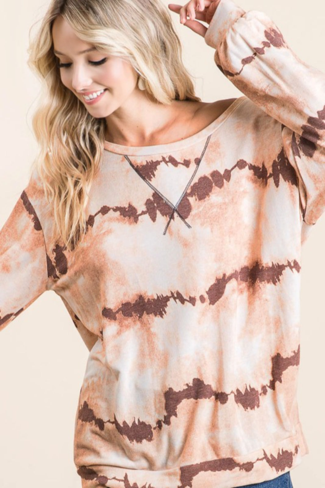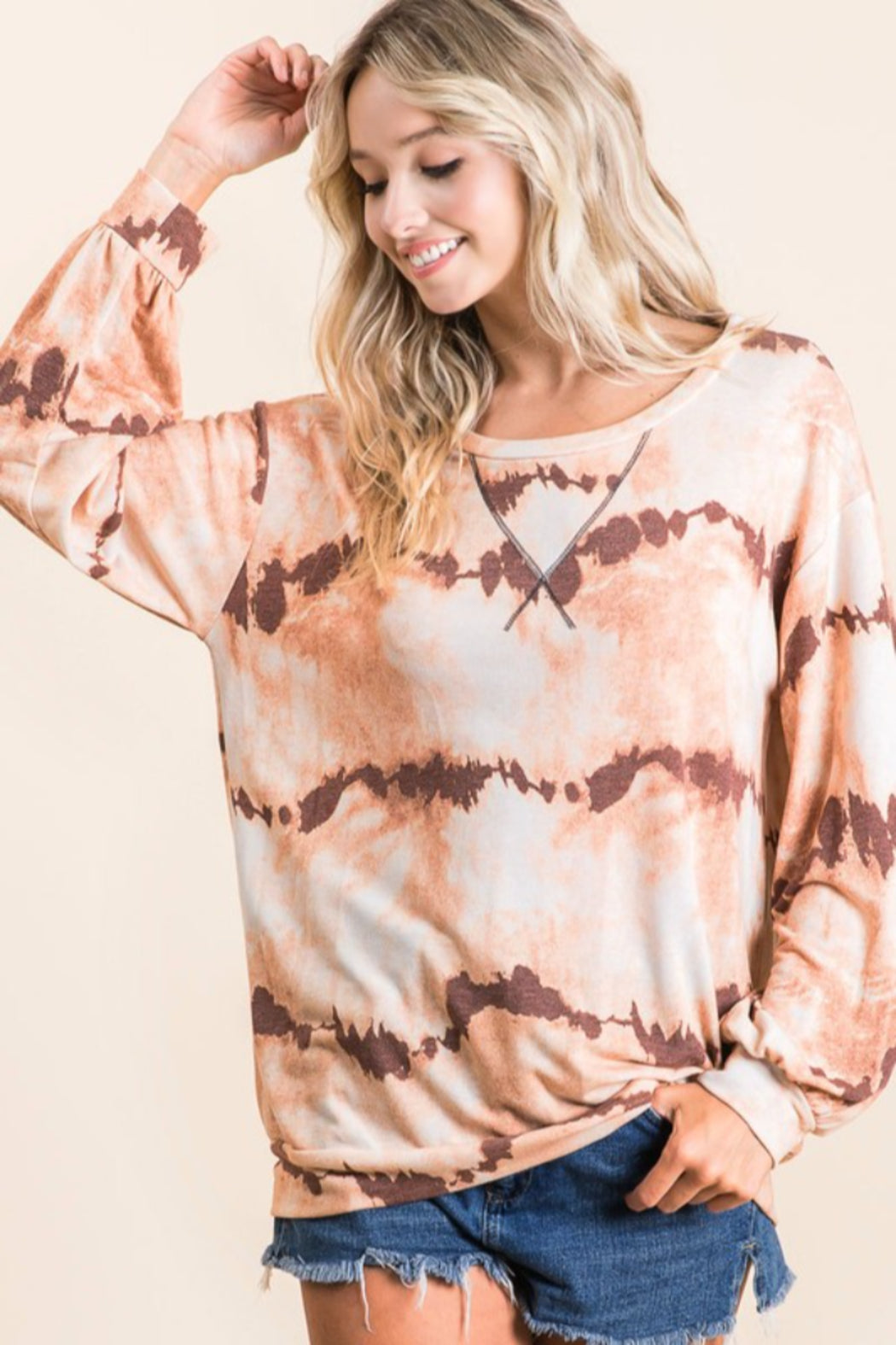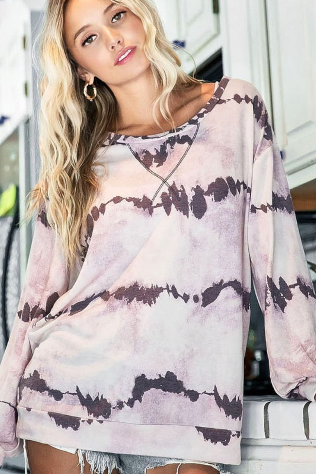 This long sleeve french terry pull over features a tie dye print, a crew neck line and a loose fit. We love this pull over to pair with leggings or jeans for a day time fall outfit.