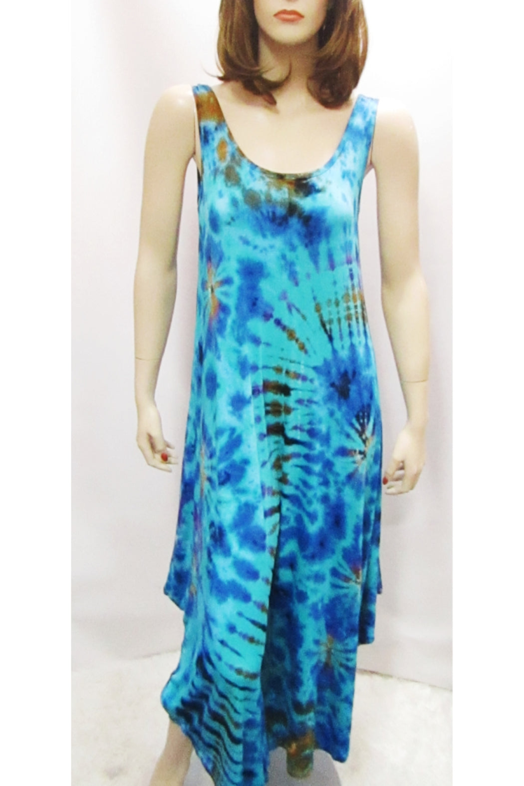 Easy breezy warm weather wear. Slip into super comfy with this sleeveless jumper in a rich turquoise tie dye print. Stretchy rayon fit with full, wide leg. Made in India.