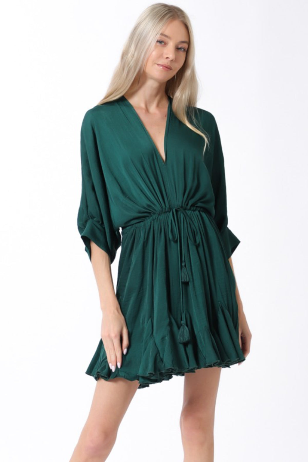 Mini dress is featured with a ruffle bottom and bubble short sleeves. Dress has a tie at the waist and an open back to be tied at the top for style.