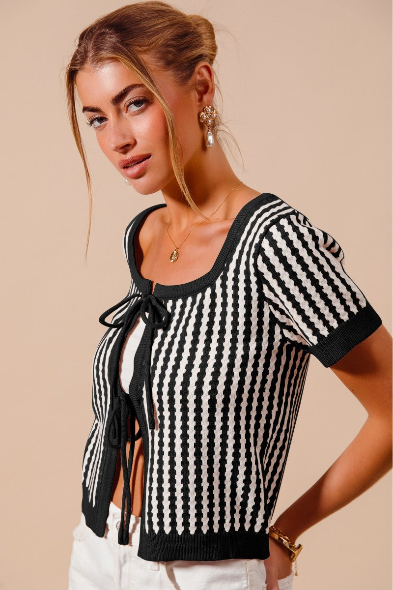 The Tie Front Stripe features a textured vertical stripe with a scoop neckline and a tie front closure.