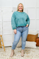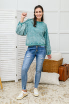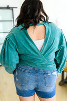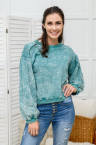 Business in the front, party in the back! The Tied Up In Cuteness Mineral Wash Sweater In Teal features a mineral wash french terry fabric that shapes a crew neckline with pleated balloon sleeves and slightly cropped fit. A cutout design at the back ends at a functional tie detail, with ribbed detail lining the hem, cuffs and neckline.