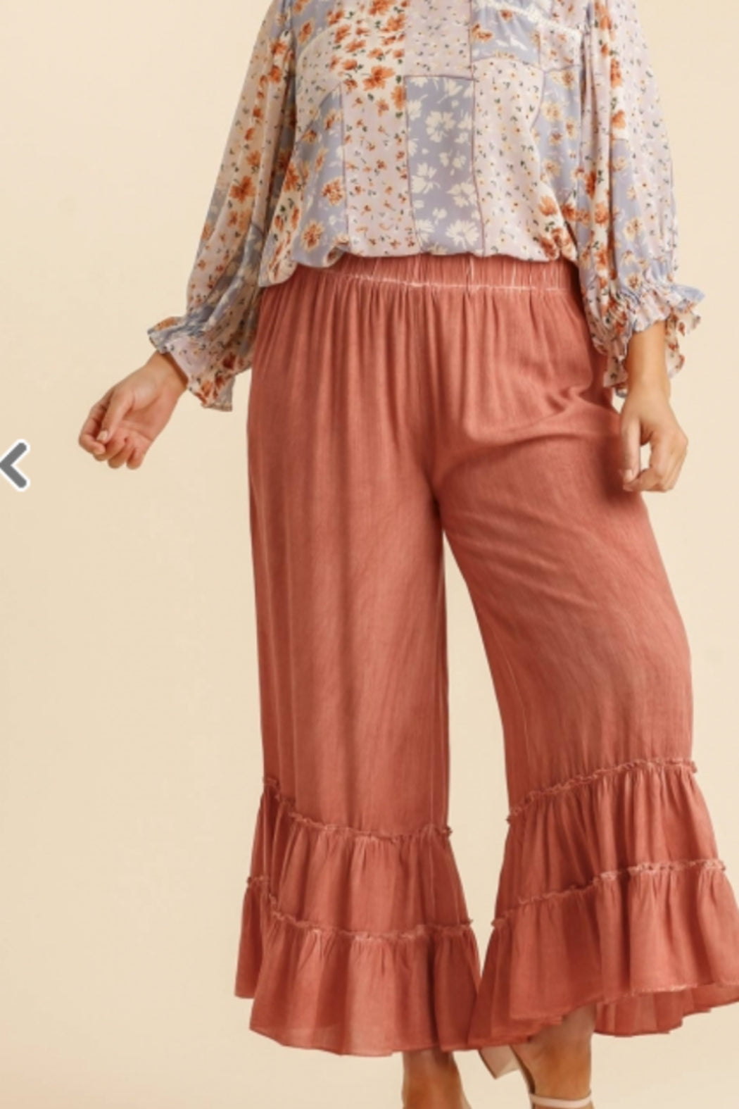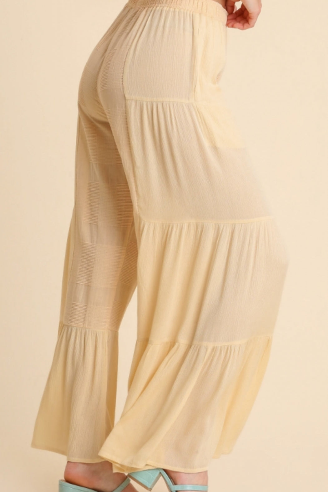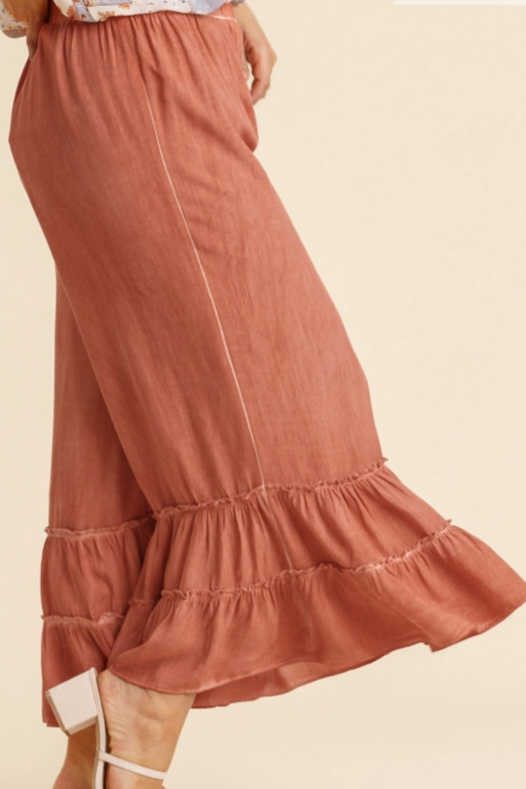 Washed Elastic Waistband Wide Leg Pants with Ruffle Tiered Hem
