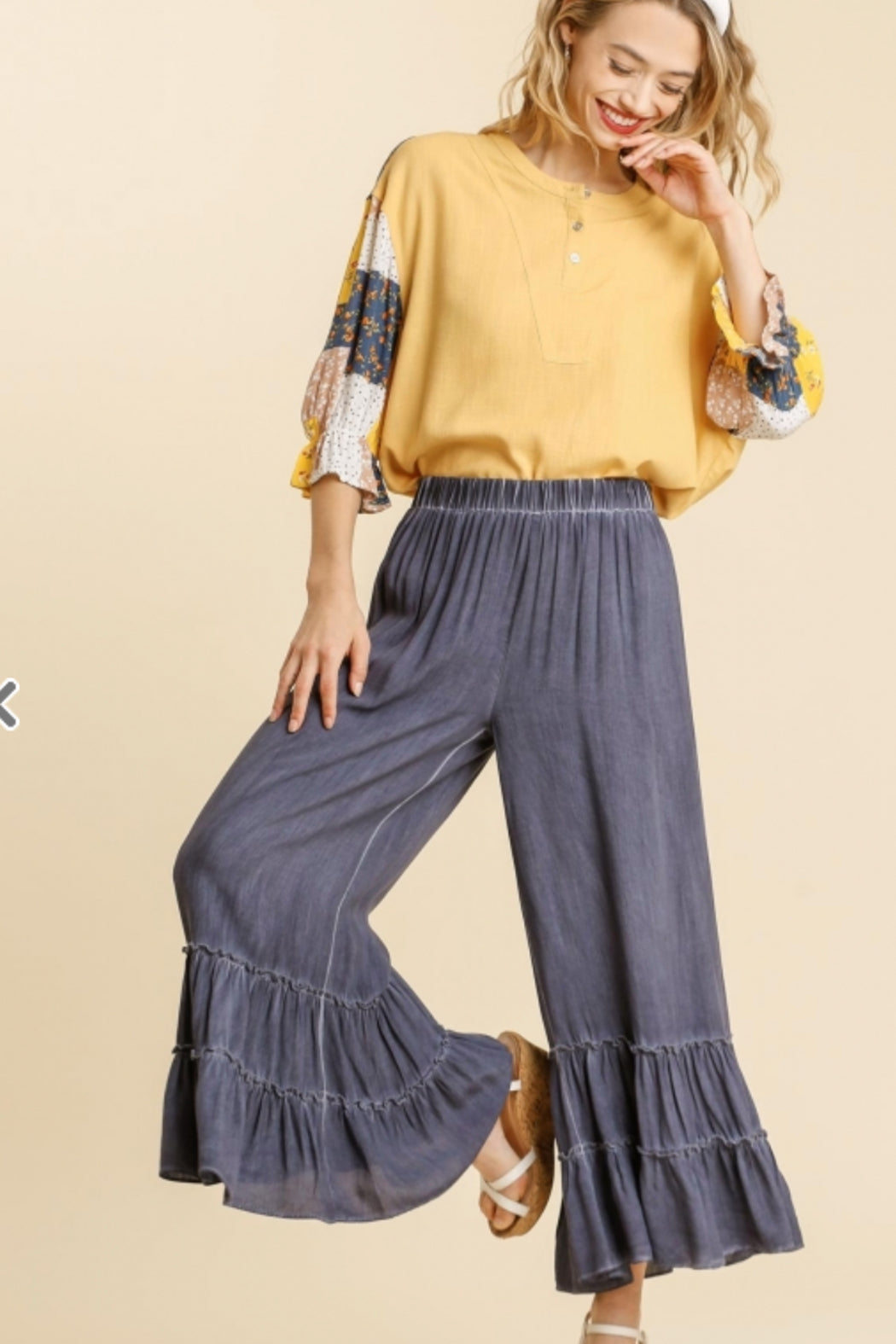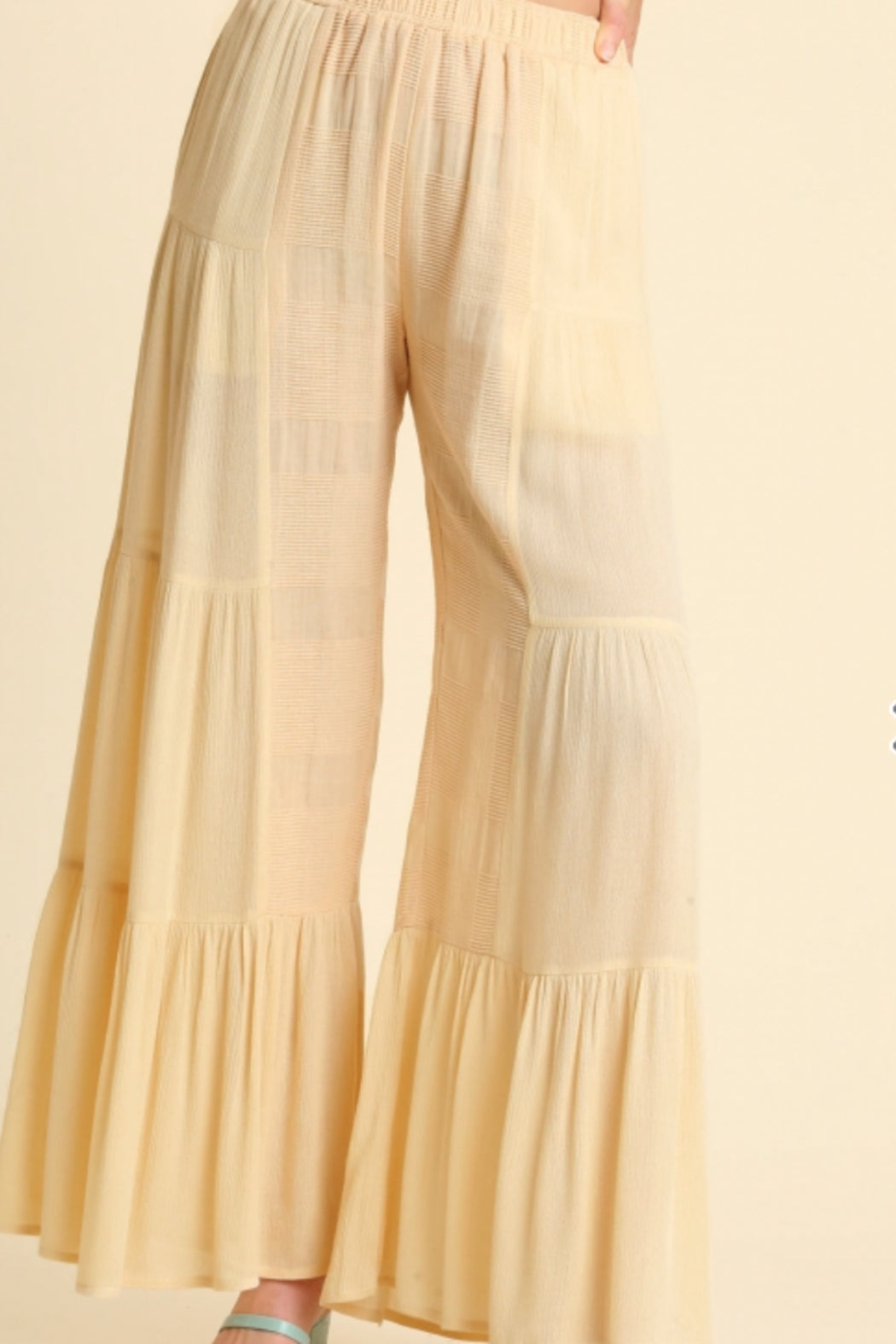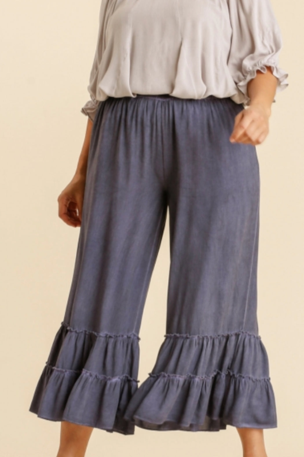 Washed Elastic Waistband Wide Leg Pants with Ruffle Tiered Hem