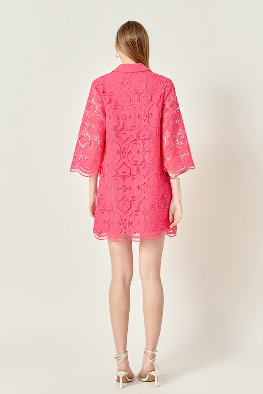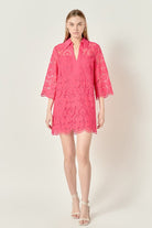 Elevate your wardrobe with our Tilly Lace Shirt Dress in vibrant hot pink. This sophisticated piece features delicate lace detailing with a comfortable lining to ensure both style and practicality. The shirt dress silhouette offers versatile styling options for both professional settings and special occasions.