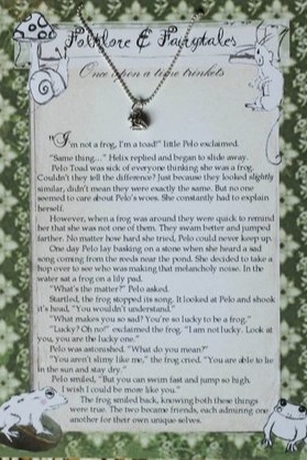 Folklore & Fairytales is a Sterling silver jewelry line of once upon a time trinkets. All include original stories and artwork and are presented on 5 x 7 card stock wrapped in cello. Necklaces are 16" and have a Folklore & Fairytales tag on back.