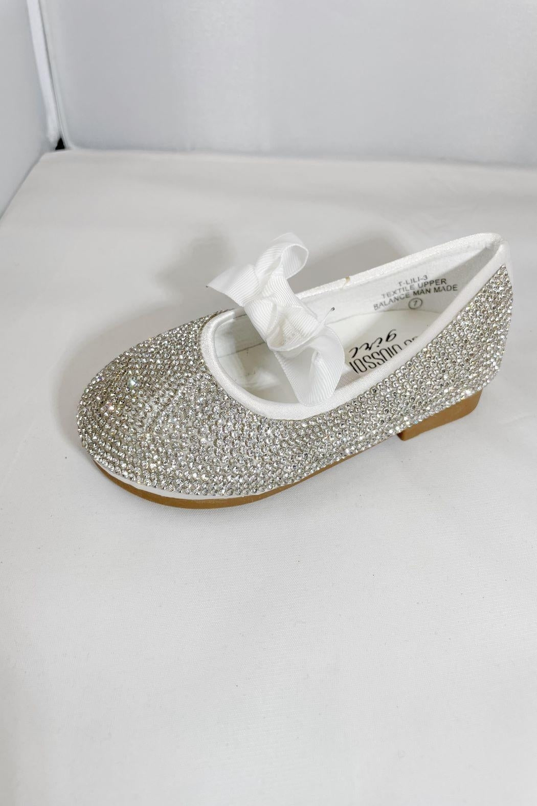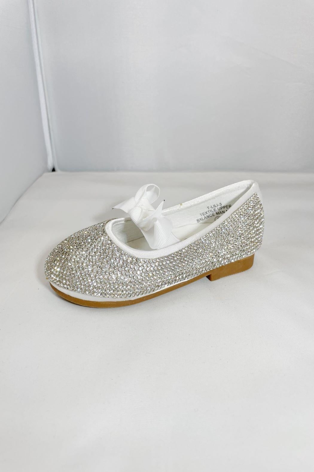 How adorable are these toddler rhinestone flats? They are perfect for every little girl in your life. They have an elastic strap that goes across the top of their foot to keep it in place and that has a cute bow on it. They have some extra cushioning in them to keep your little girl comfortable. The sizes are all toddler size.