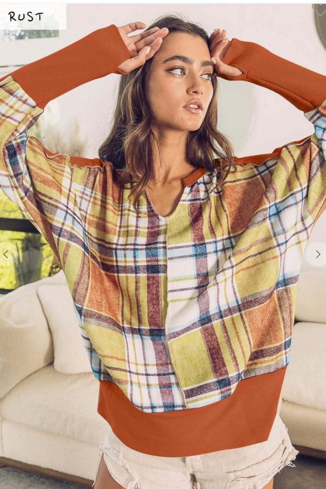 Pullover top in rust with plaid print contrast detail, v-neck, long wide solid cuff sleeves with thumb opening, reverse stitched exposed seam detail, wide elastic hemline. Very soft brushed hacci, polyester spandex blend, non-sheer, made in Mexico.