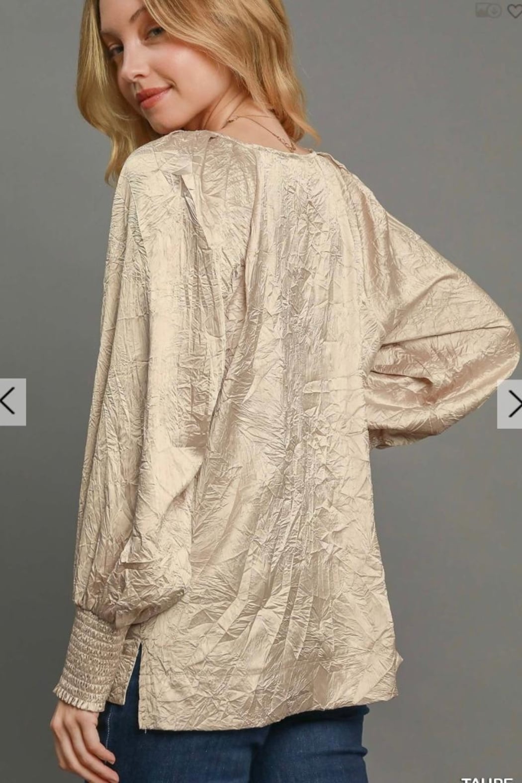 Pullover top in taupe, crinkle look satin finish, rounded neckline, long pleated sleeves with wide smocked cuff, loose fit bodice with side split at hem. Lightweight polyester, non-sheer.