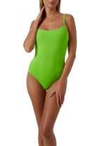 In a tantalizing 'Lime' hue, the Tosca Over the Shoulder Swimsuit is perfect for sun-drenched days. The playfully bright swimsuit has removable pads to create a smooth shape over the bust, with the highest quality swimwear fabric sitting close against the body. Over the shoulder straps are secured with petite golden ring trims at the front of the suit with adjustable sliders at the back. Tosca has a sultry low-back and medium coverage bottoms. Pair the vivid hue designer swimsuit with white accessories for a breathtaking look.