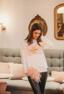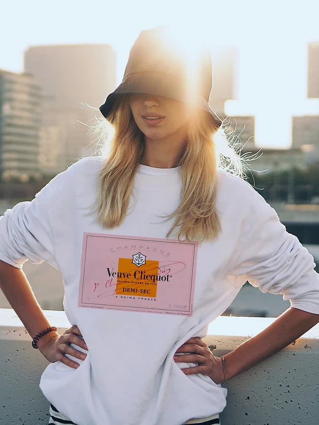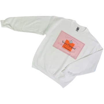 Pink bubbly Veuve sweatshirt. Unisex fit. 50% cotton 50% poly.