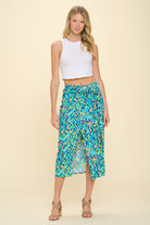 Add a splash of color to your wardrobe with this eye-catching abstract print midi skirt. The striking combination of vivid blues, greens, and hints of orange creates a dynamic, artistic look that stands out in any setting. Featuring a wrap design with a side-tie detail, this skirt is as functional as it is fashionable, offering a comfortable fit and a sleek front slit for ease of movement. Perfect for beach vacations or summer outings, pair this vibrant skirt with a simple top for a bold, statement-making look.