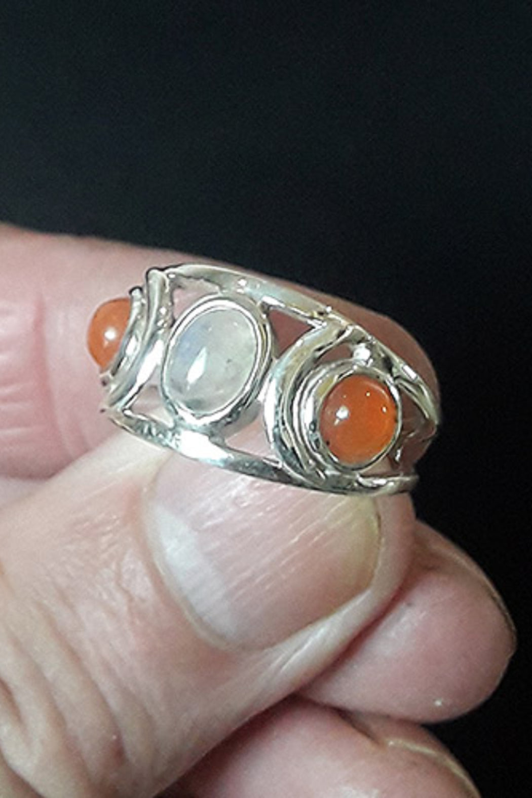 A Beautiful Moonstone goddess Ring.. . Moonstone helps calm stress and overreaction. It brings hope, enhances feminine energies, sensitivity, intuition, and psychic abilities . . . By stimulating the sacral chakra, Sunstone brings a flood of light into dark corners of the mind, making it an excellent healing aid for clearing away negative thought patterns.Length 3/4" Width 1/2" Total Weight 5 Grams