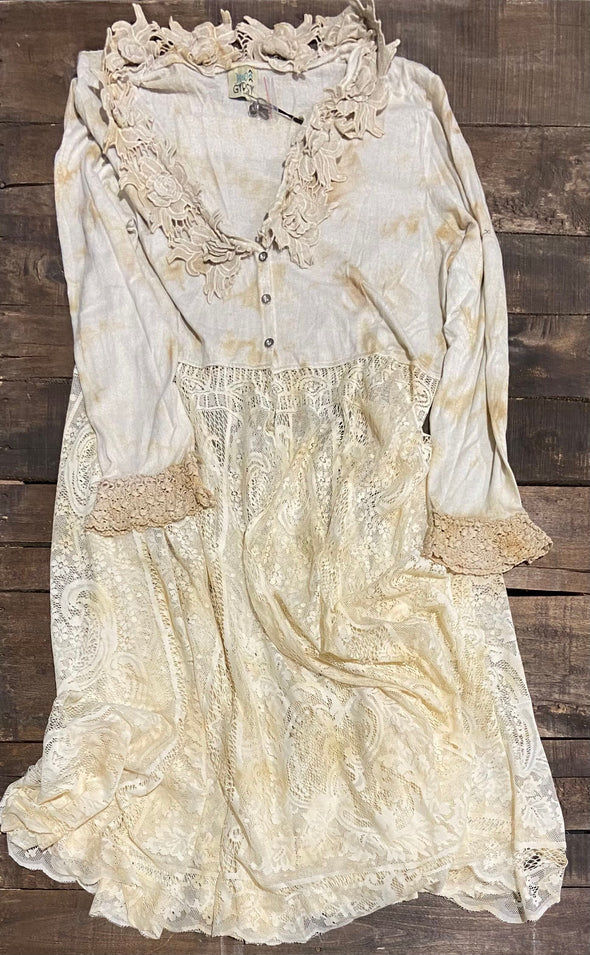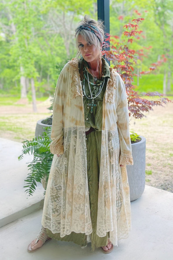 Experience vintage beauty in our Trista Fade Into You Duster. Tea-stained cotton and delicate lace come together to create a statement piece that won't soon be forgotten. Whether worn open or closed with its 3-button front, you'll be sure to turn heads. Smash fade into the night!