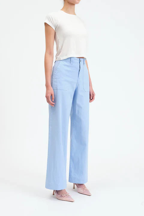 The best of both worlds. The Trooper in Open Air is work-wear meets trouser, featuring utility-inspired pockets, wide legs, and clean hems against a bright blue canvas fabric.