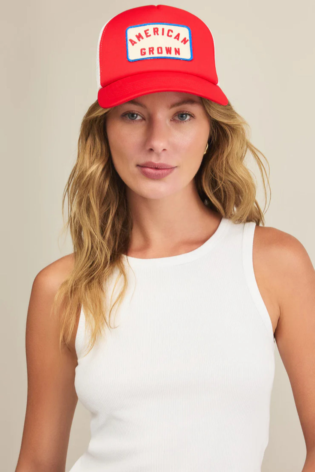 A true classic with a bold touch, this red trucker hat features an "American Grown" embroidered patch for a vintage-inspired feel. With an adjustable back and structured fit, it’s the perfect go-to for sunny days and effortless, off-duty style.