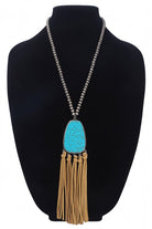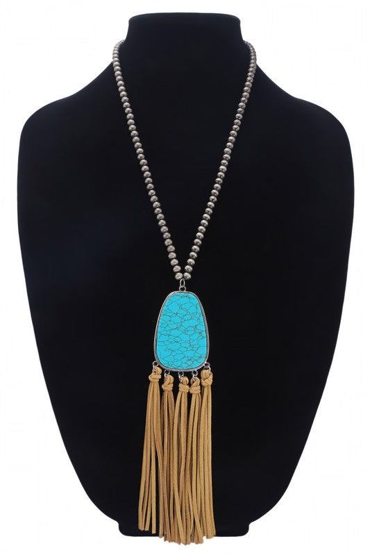 Stunning metal ball bead necklace with a semi-precious stone pendant and playful tassels.