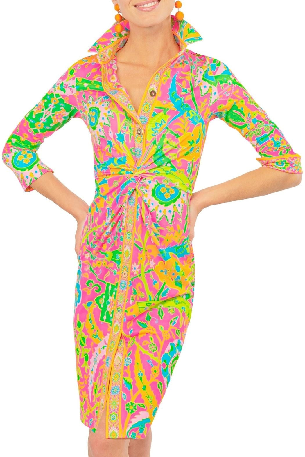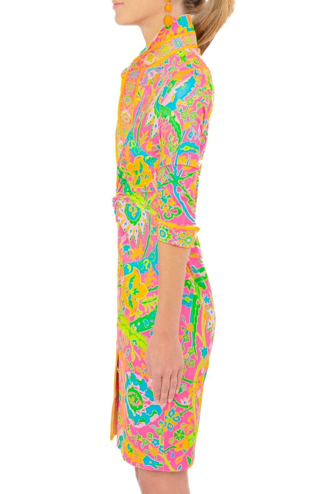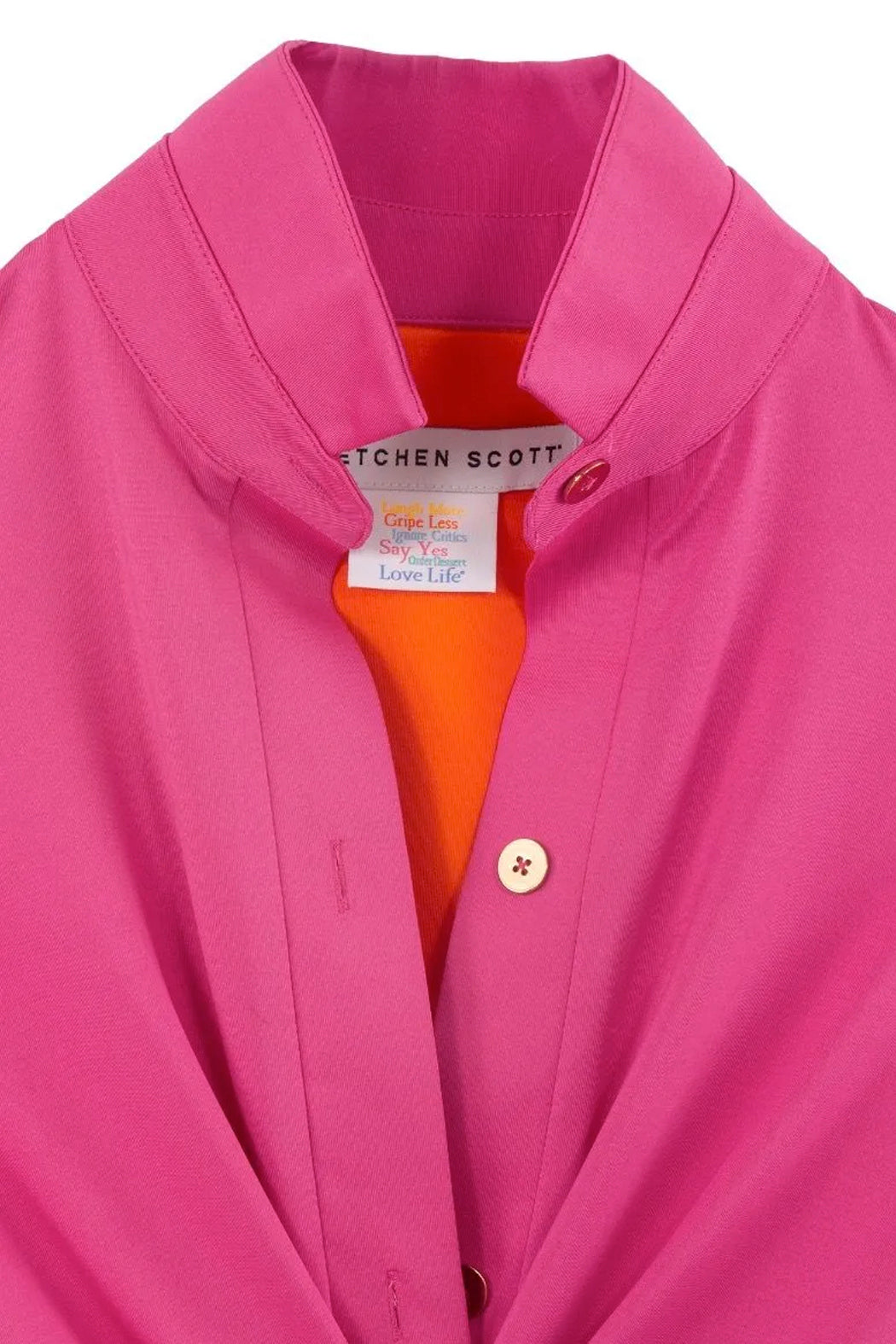 Contrast Print Turn Back Cuffs. 4" Hand Hem. Placket with Gold Tone Buttons. Contrast Inside Back Panel.