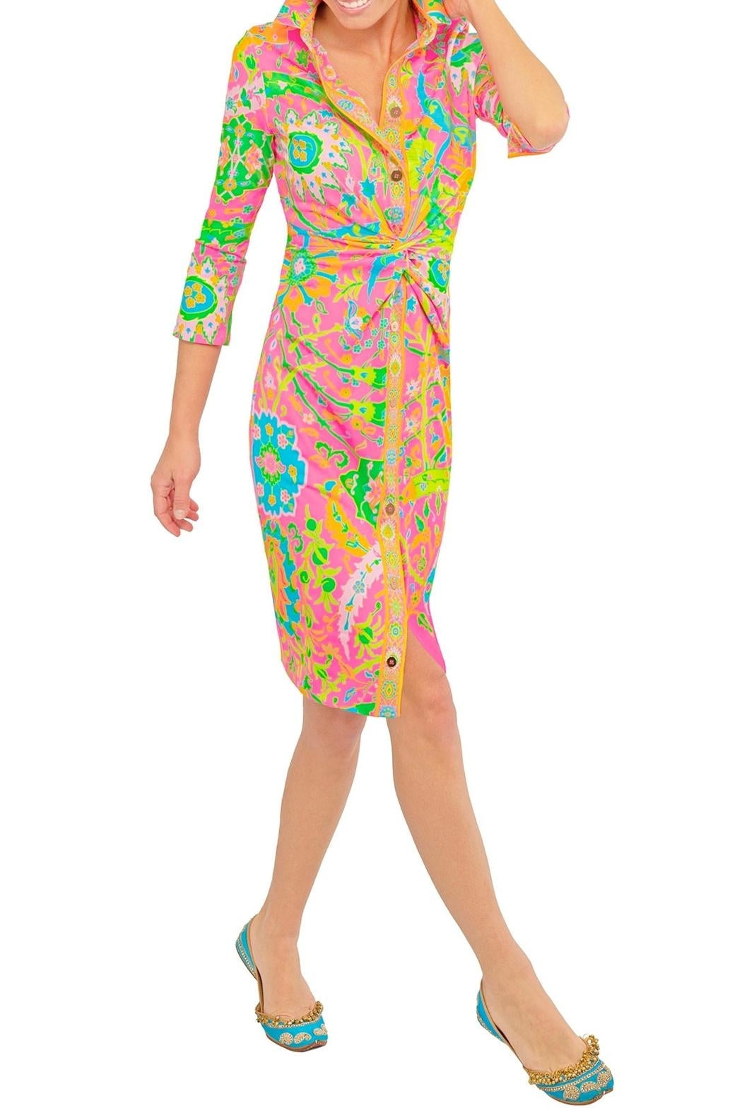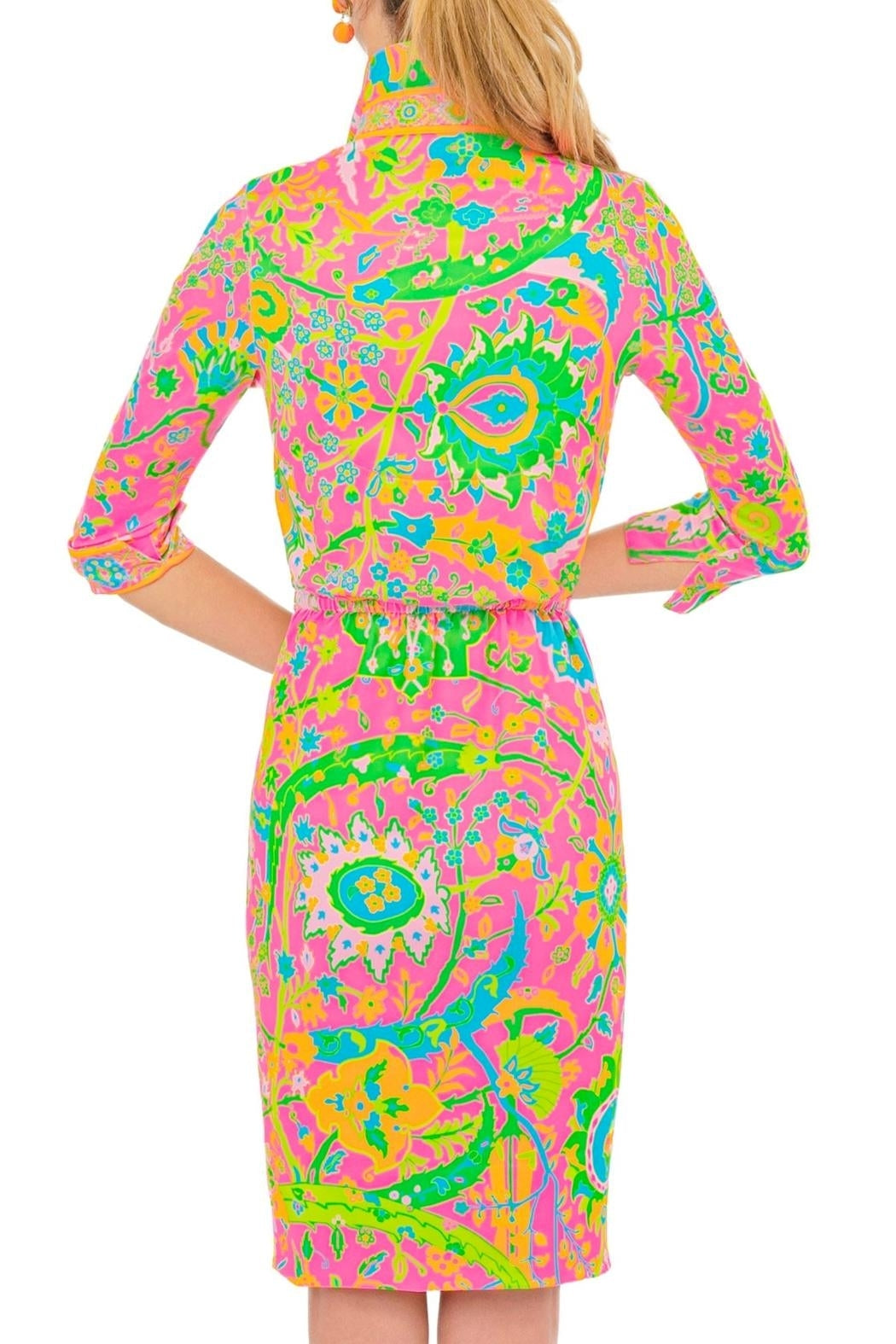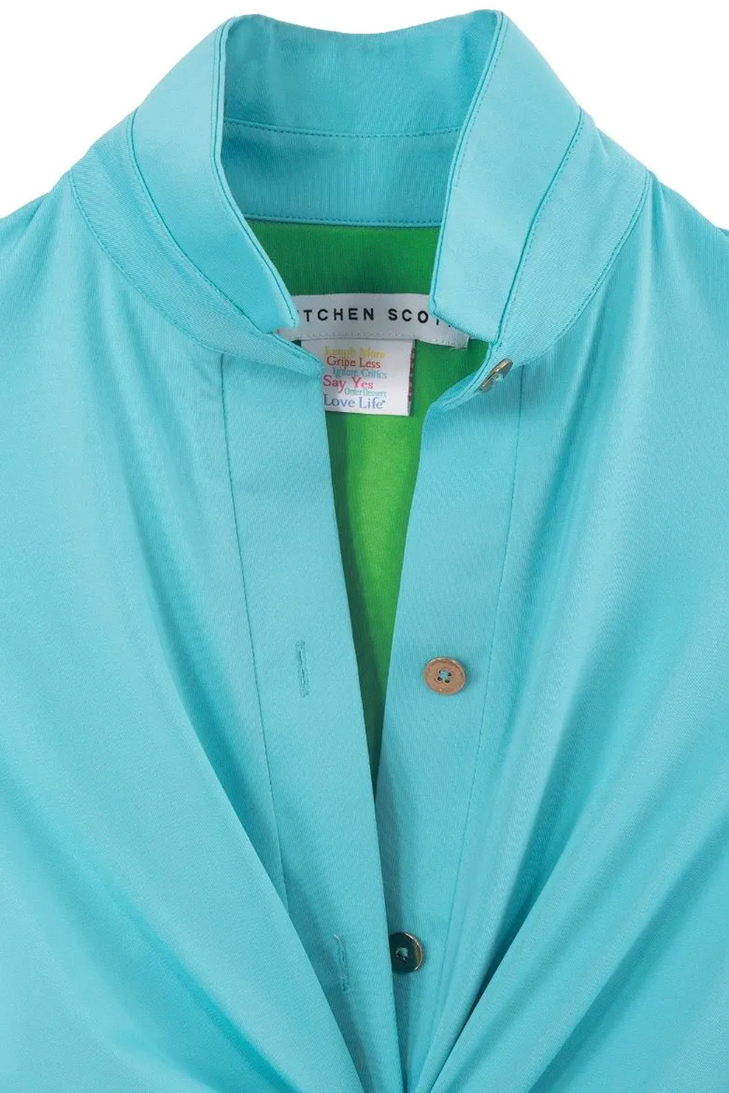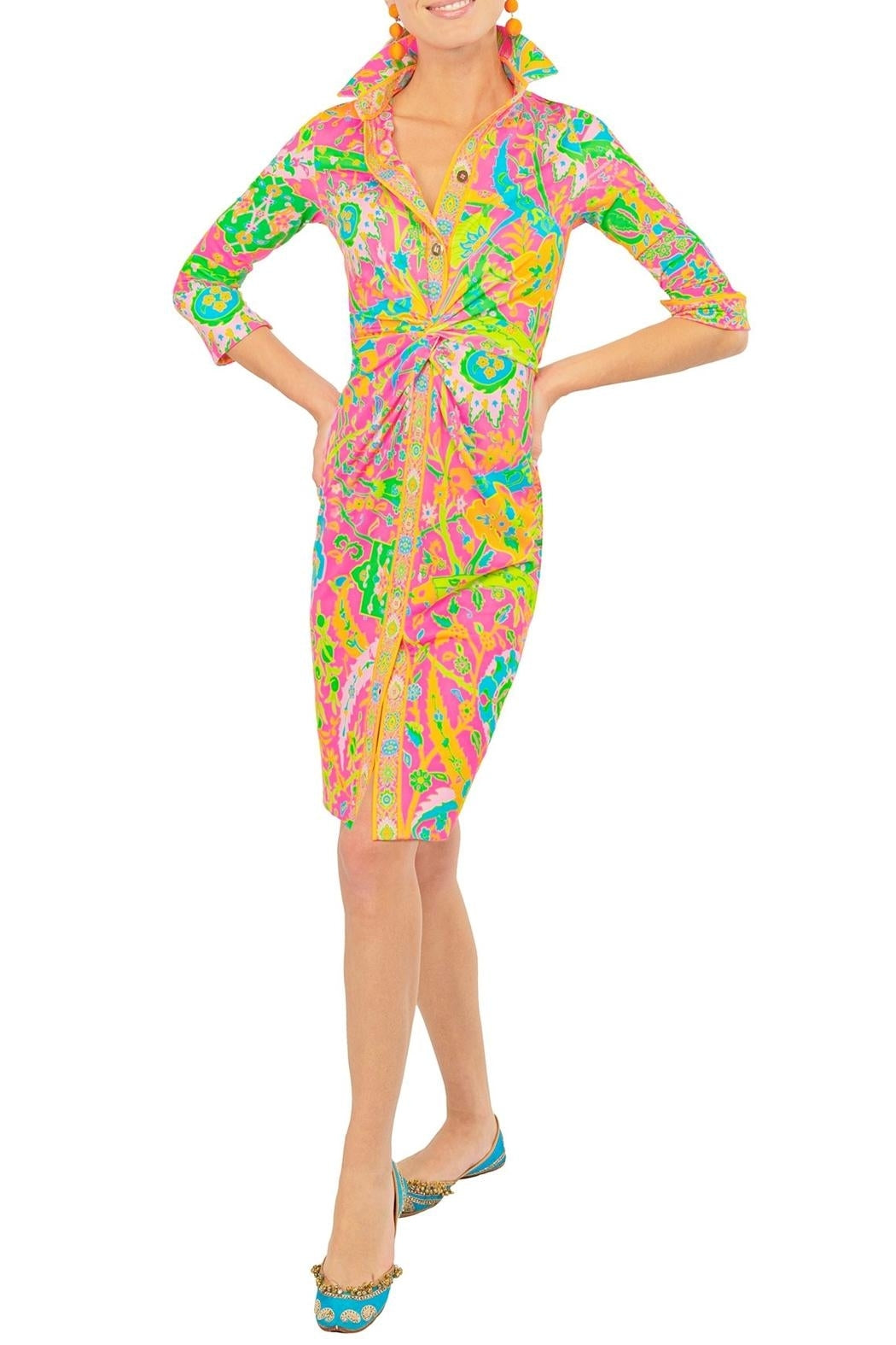 Contrast Print Turn Back Cuffs. 4" Hand Hem. Placket with Gold Tone Buttons. Contrast Inside Back Panel.