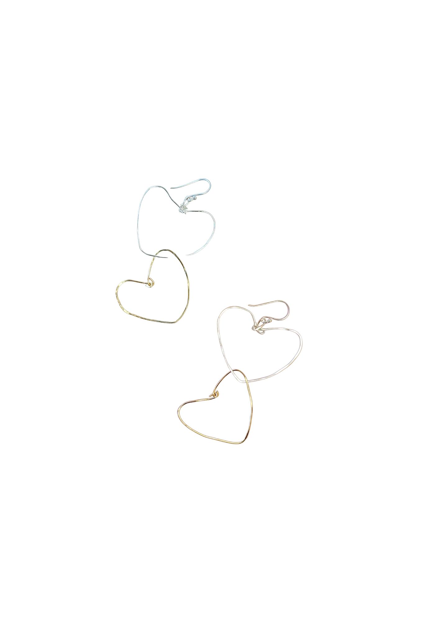 Double heart drop earring with a hammered gold heart and polished silver heart.