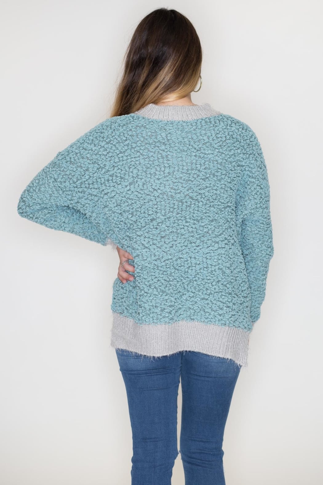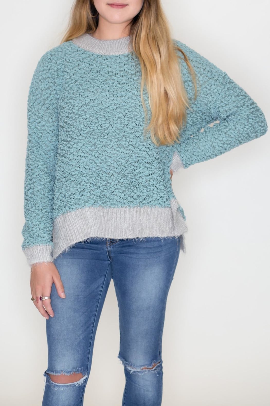 Sage and grey two tone popcorn and soft fur pullover sweater. Round neck with long sleeves, drop shoulder, side slits, high and low hem, and ribbed on neck, cuffs and hem