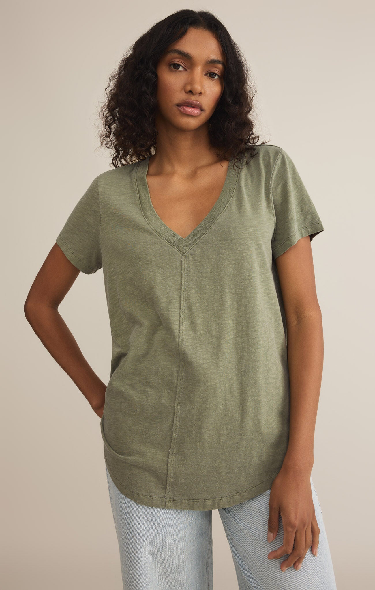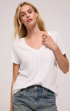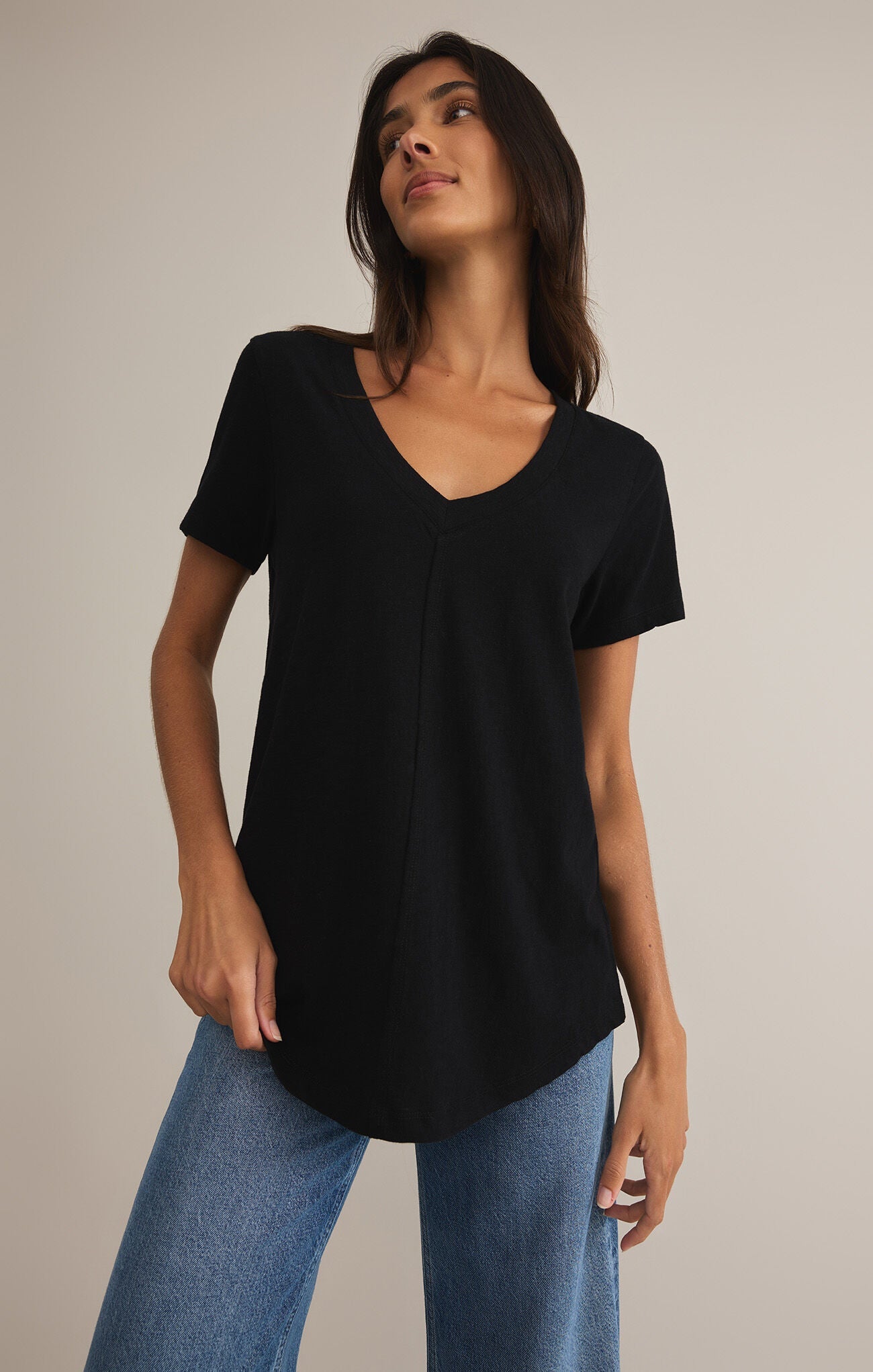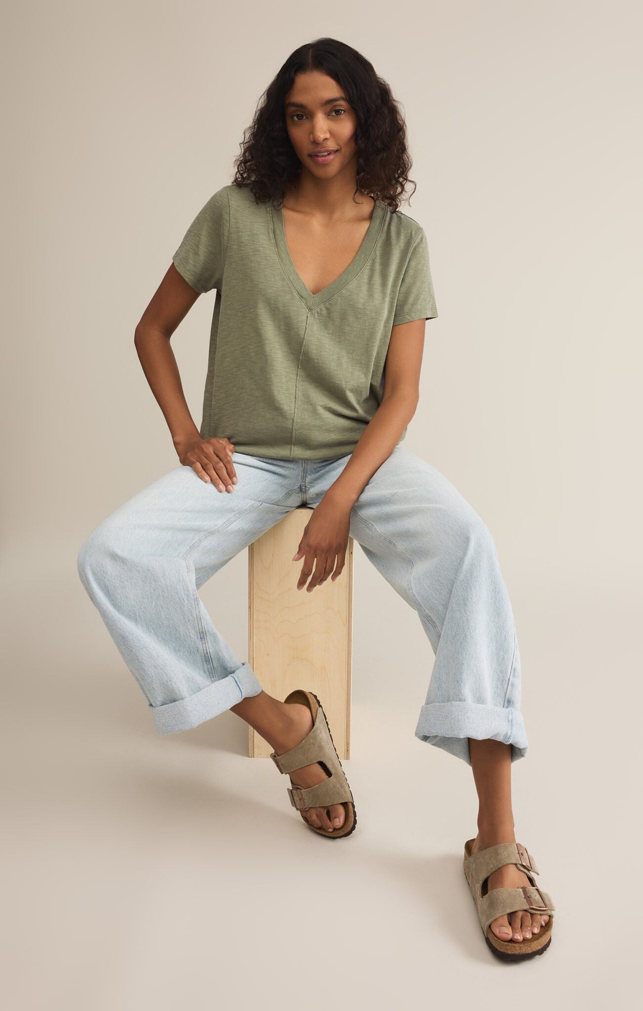 The Asher V-Neck Tee was made to be worn season after season, and features center seams at the front and back, with a flattering curved hem and longer length. We love it with denim.