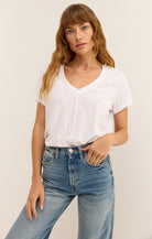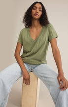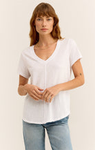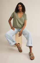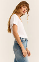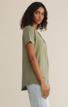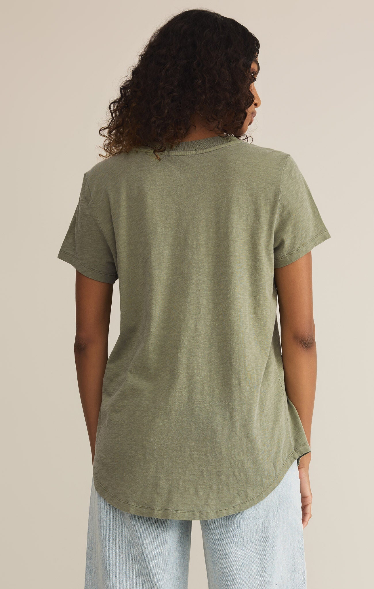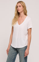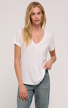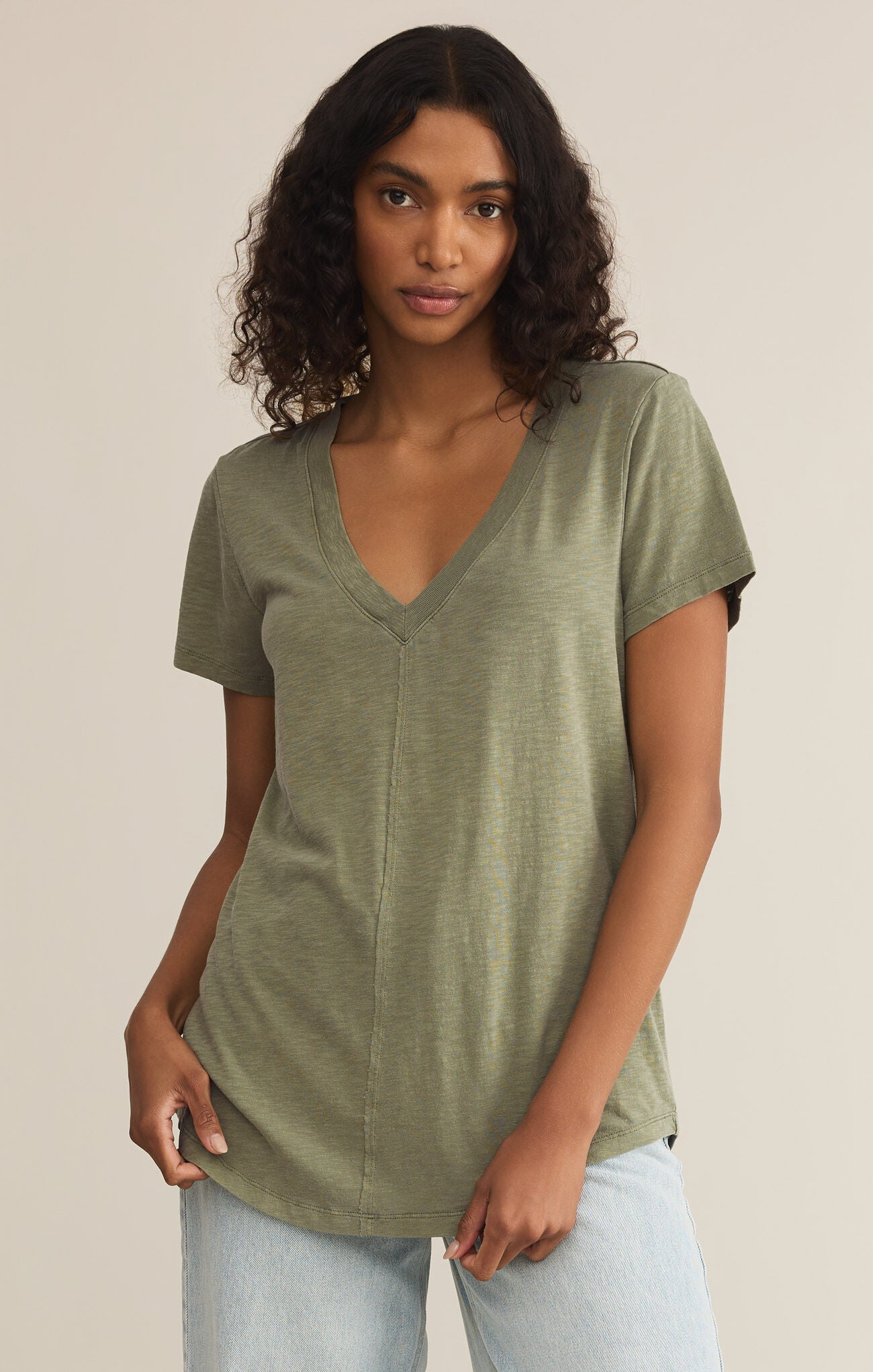 The Asher V-Neck Tee was made to be worn season after season, and features center seams at the front and back, with a flattering curved hem and longer length. We love it with denim.